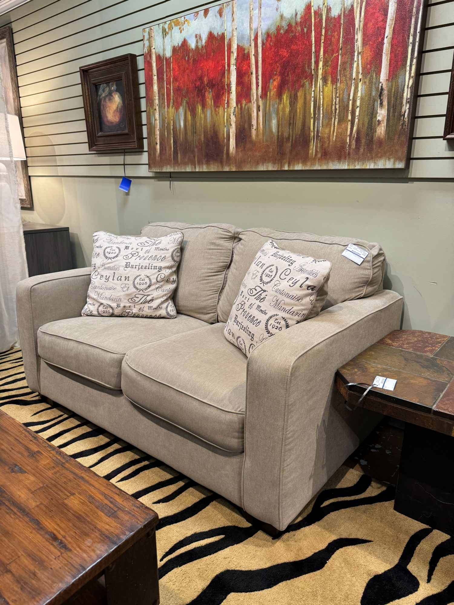 Ashley Alenya loveseat in a quartz upholstery. Comes with two reversible patterned accent pillows. Sleek, clean lines with smooth track arms. Would work well in almost any style home. 58"L x 38"D x 32"H.