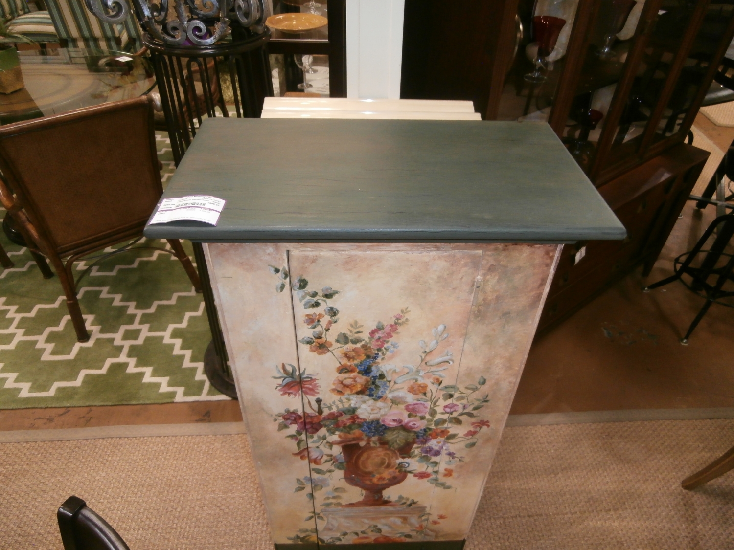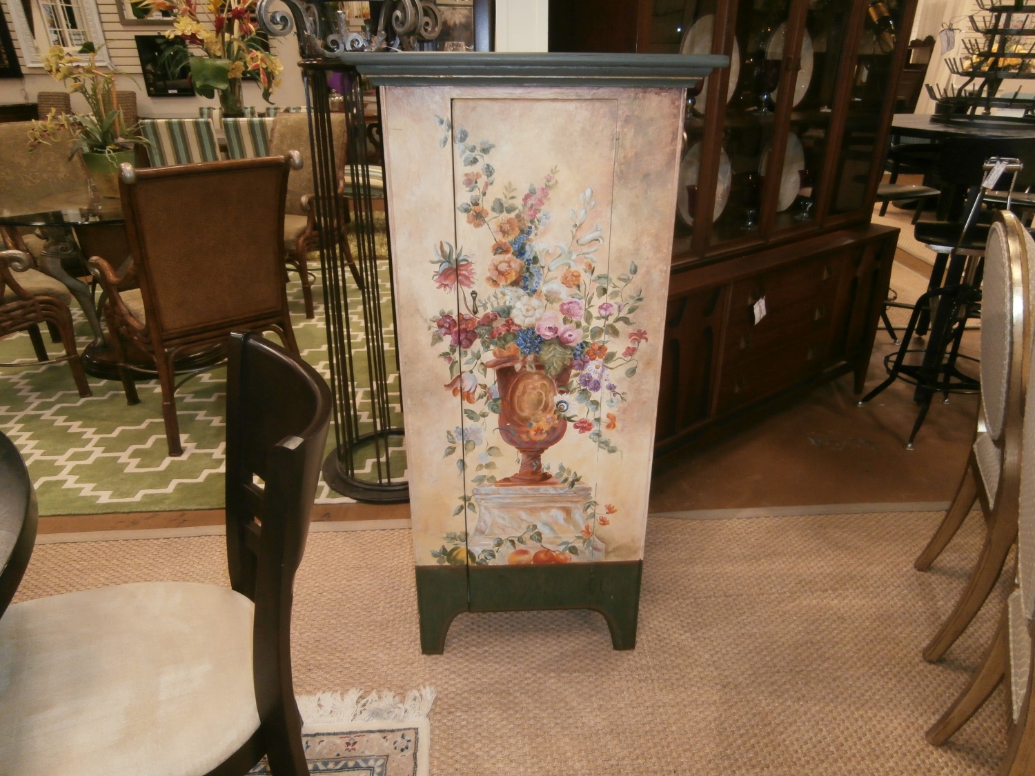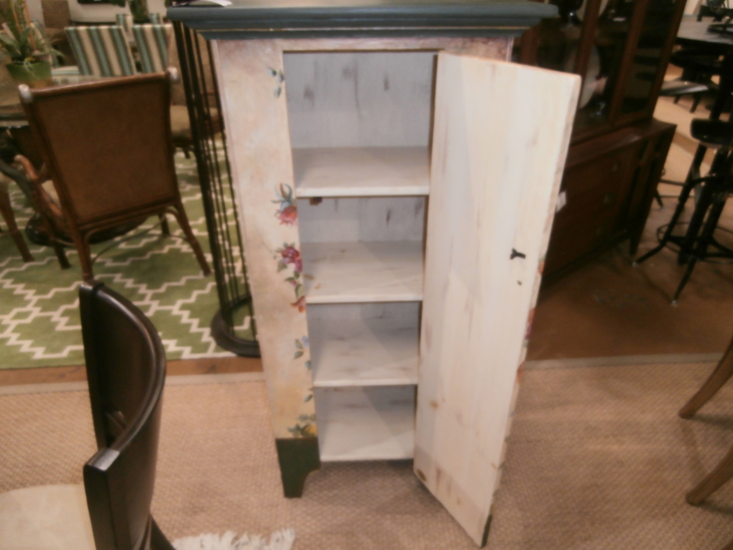 Habersham painted one door cabinet with inside shelves. Measures 24"W,14"D,51"H in green and creme.