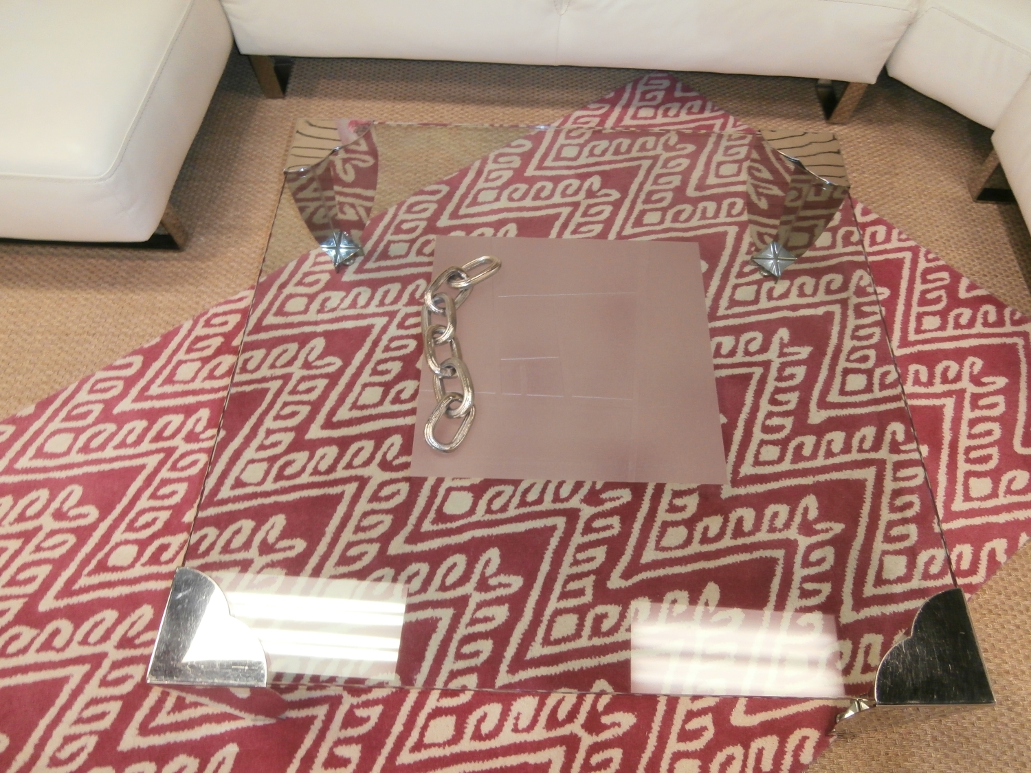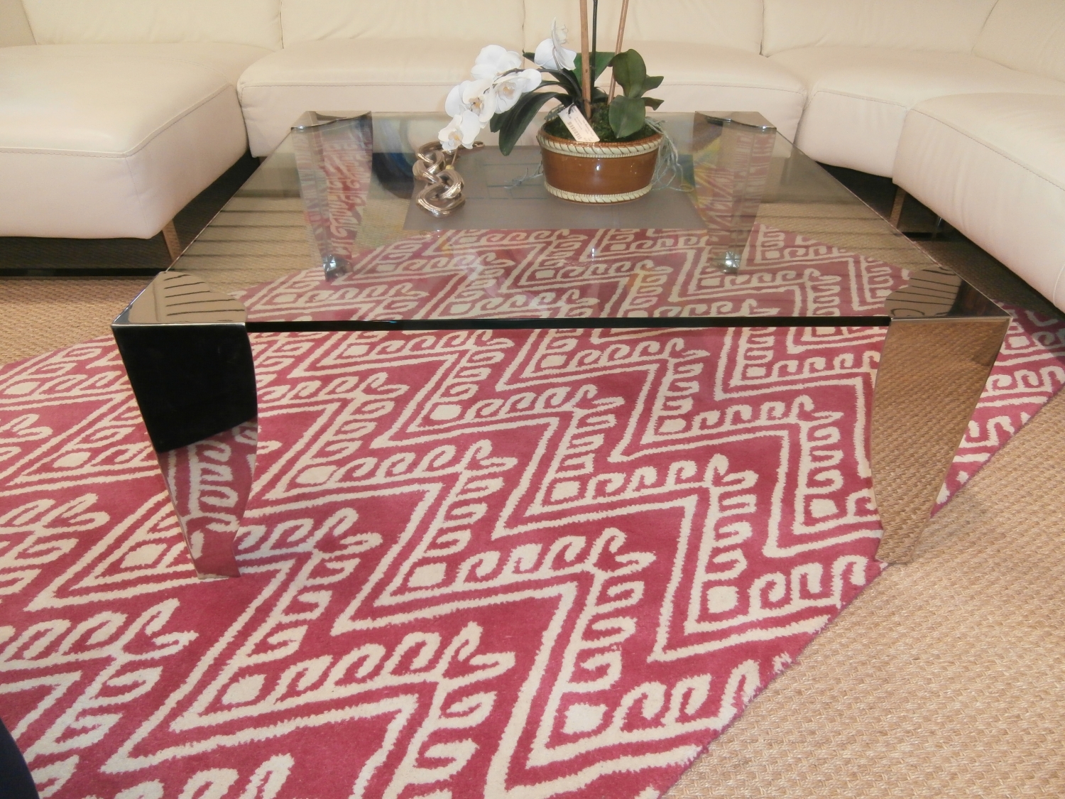 Modern glass coffee table with etched top measuring 54"W,30"D,16"H.