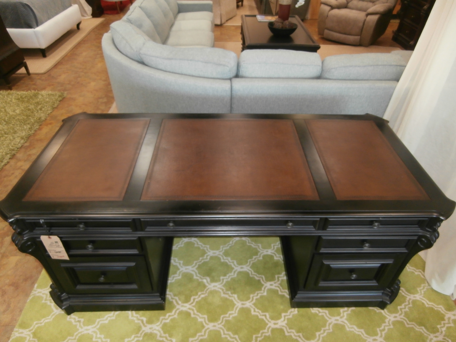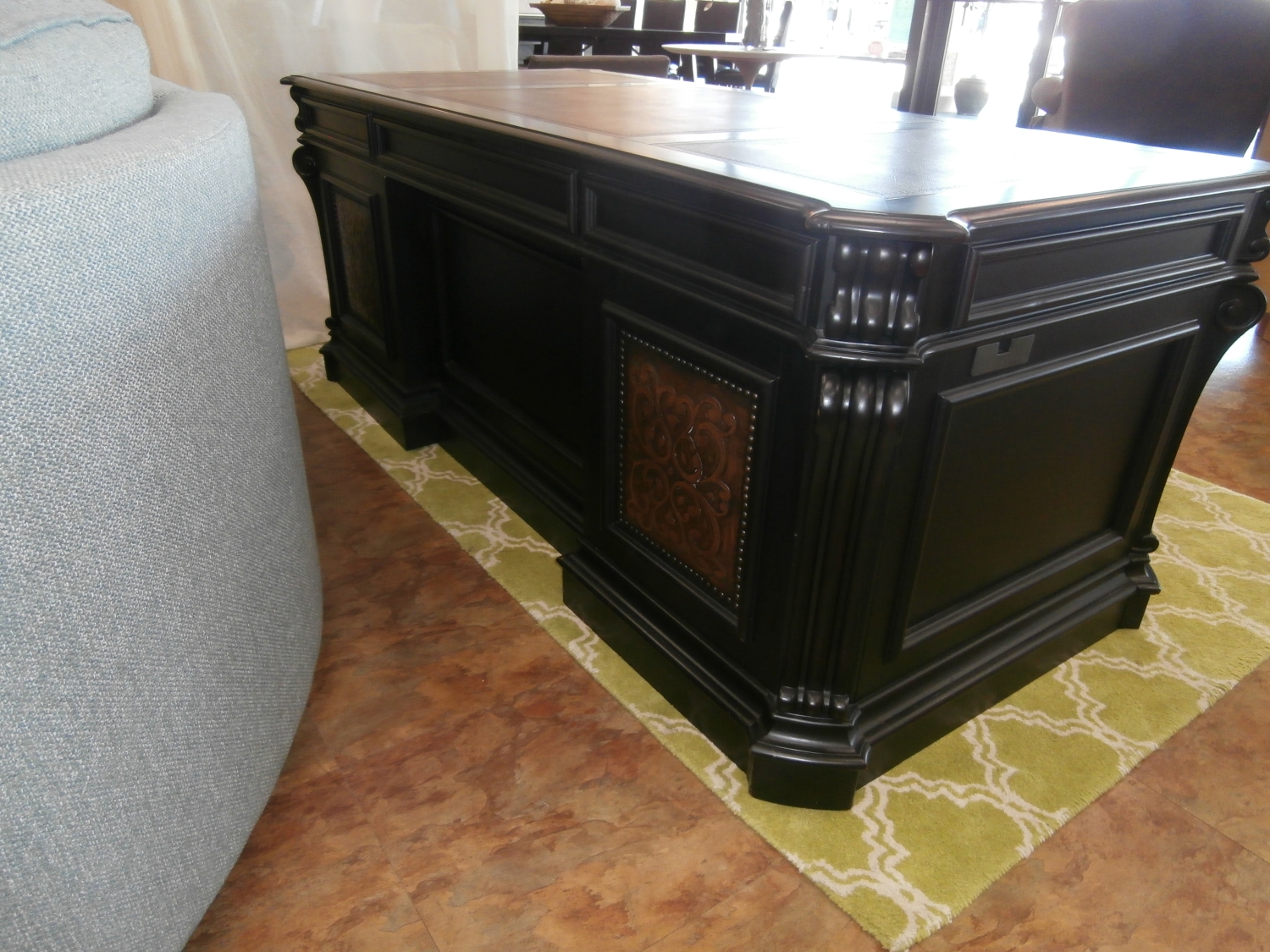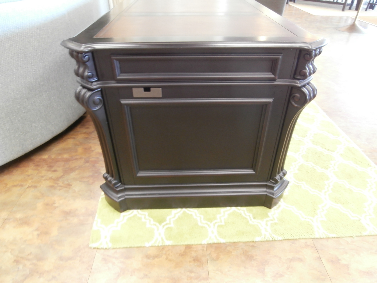 With a pedigreed design details like a bonded leather top, carved scroll motif accents, and carved leather panel insets on the front of the case with nail head trim, the Telluride desk makes work an adventure. 75"W,35"D,30"H