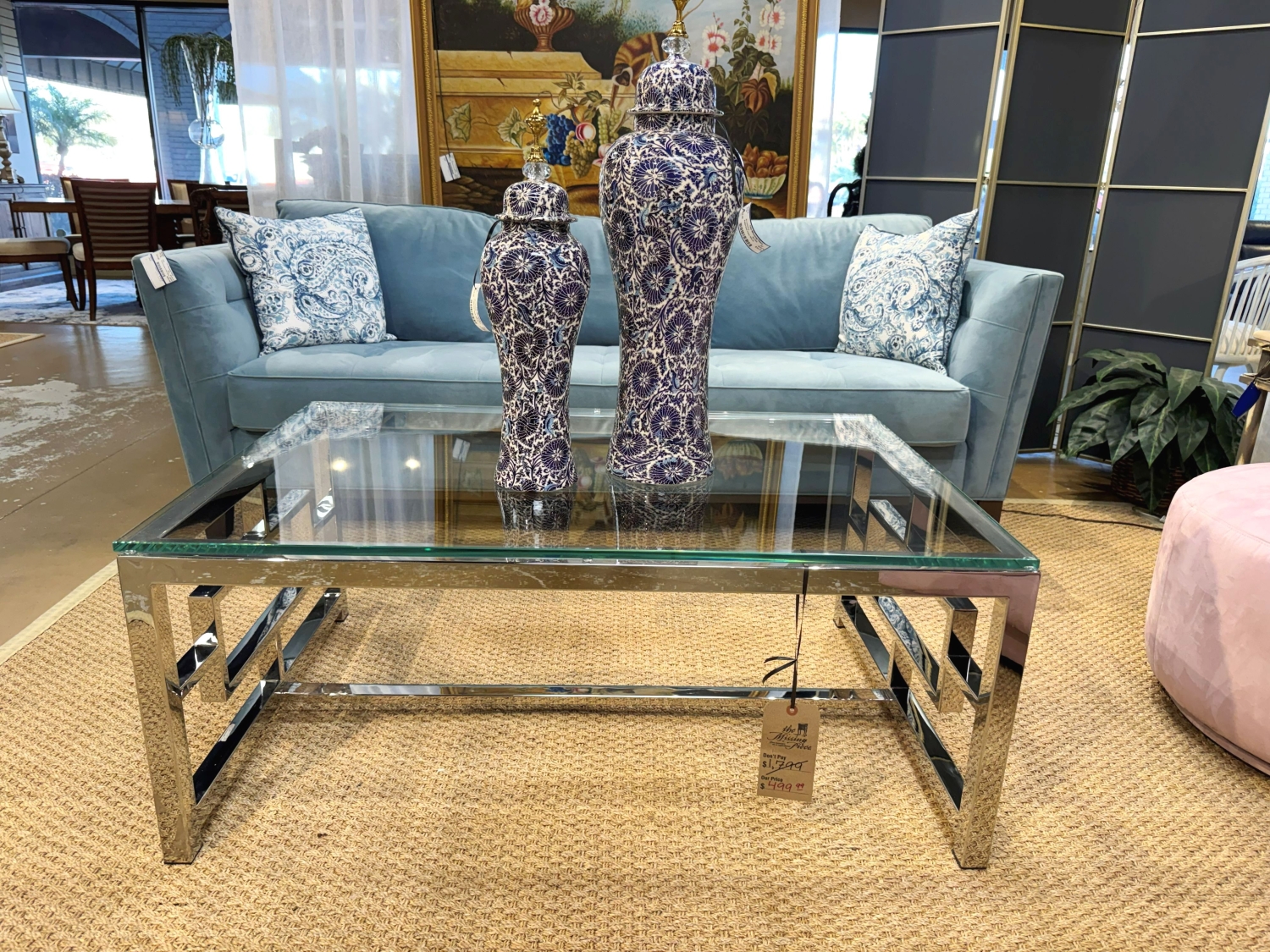 Lexington contemporary style glass top coffee table on silver metal frame. 48"long x 32"wide x 20"high.