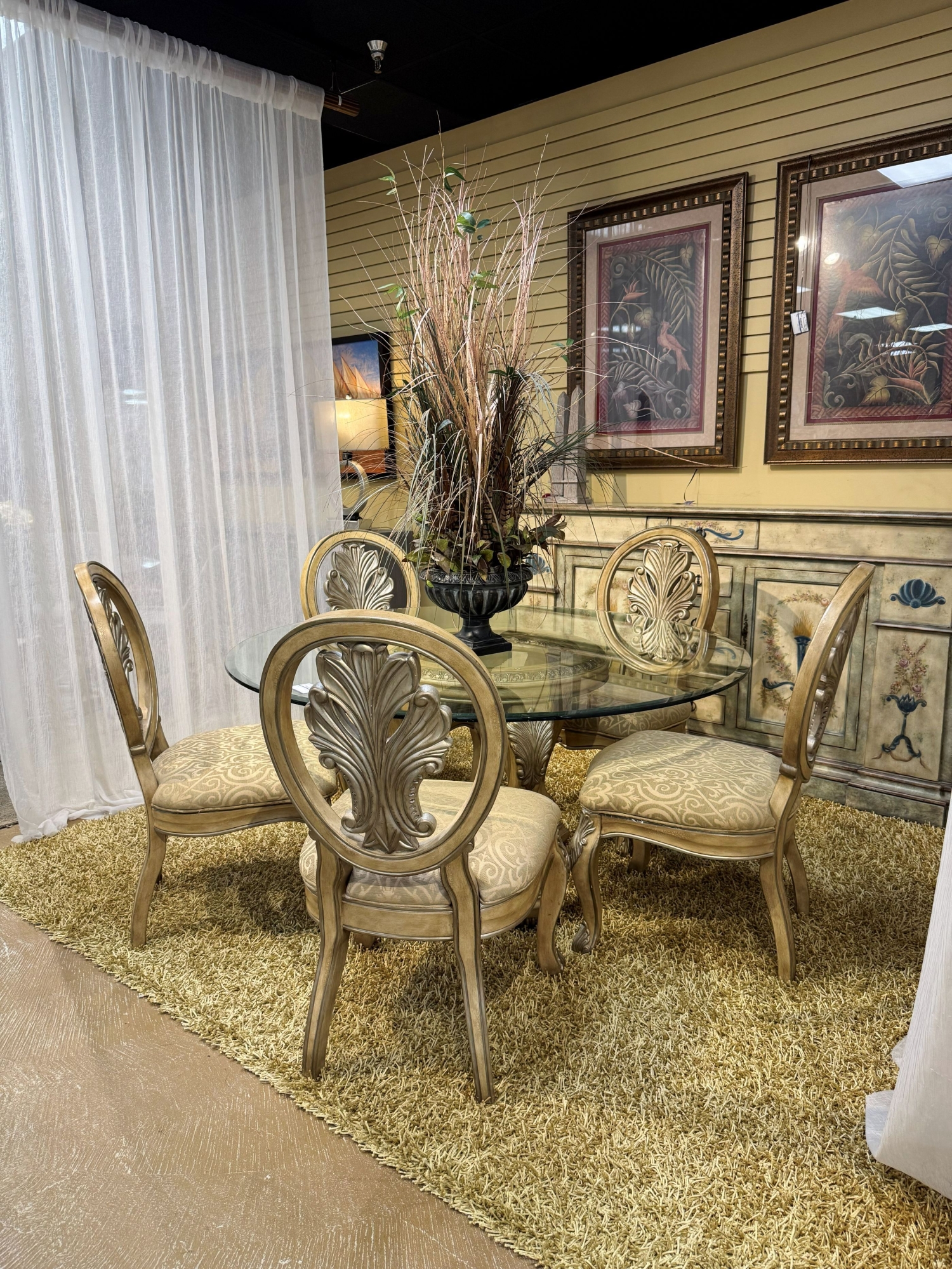 Schnadig traditional style glass top dining table on ornate bisque base with five matching oval back chairs. The chairs have brushed silver accents and beige patterned seats. 60"round.