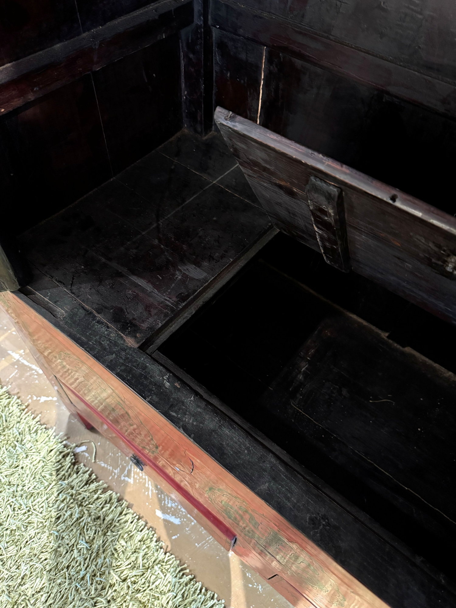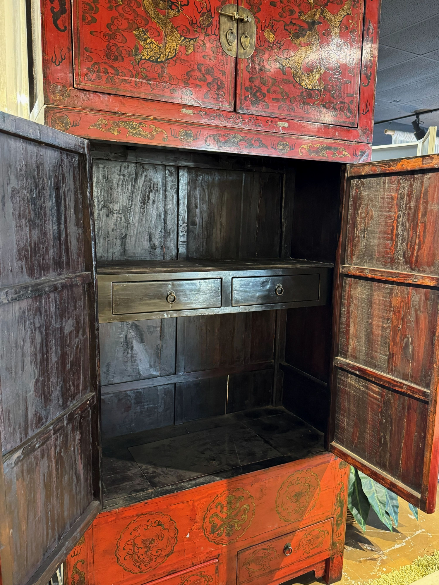 Two piece rustic Asian cabinet. There is a shelf inside with two drawers and a hidden lift top compartment for additional storage. Below there are two more drawers. 44"W x 19"D x 94"H. At posting, we have two.