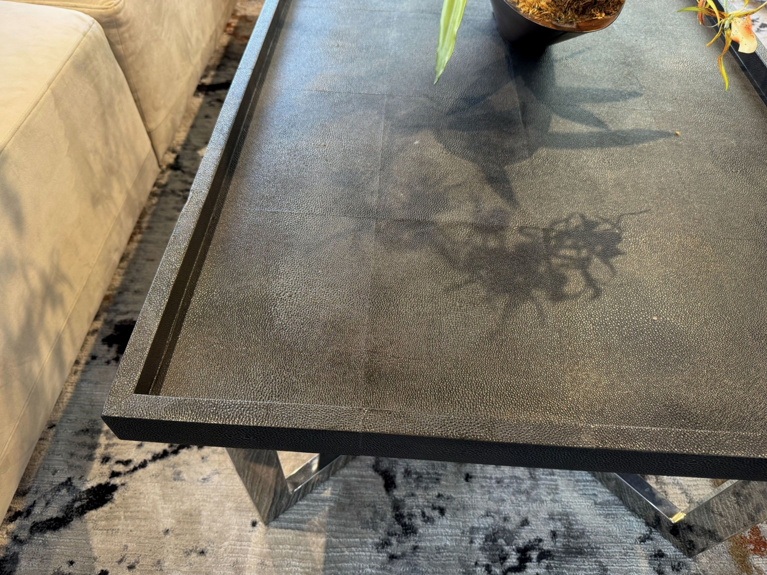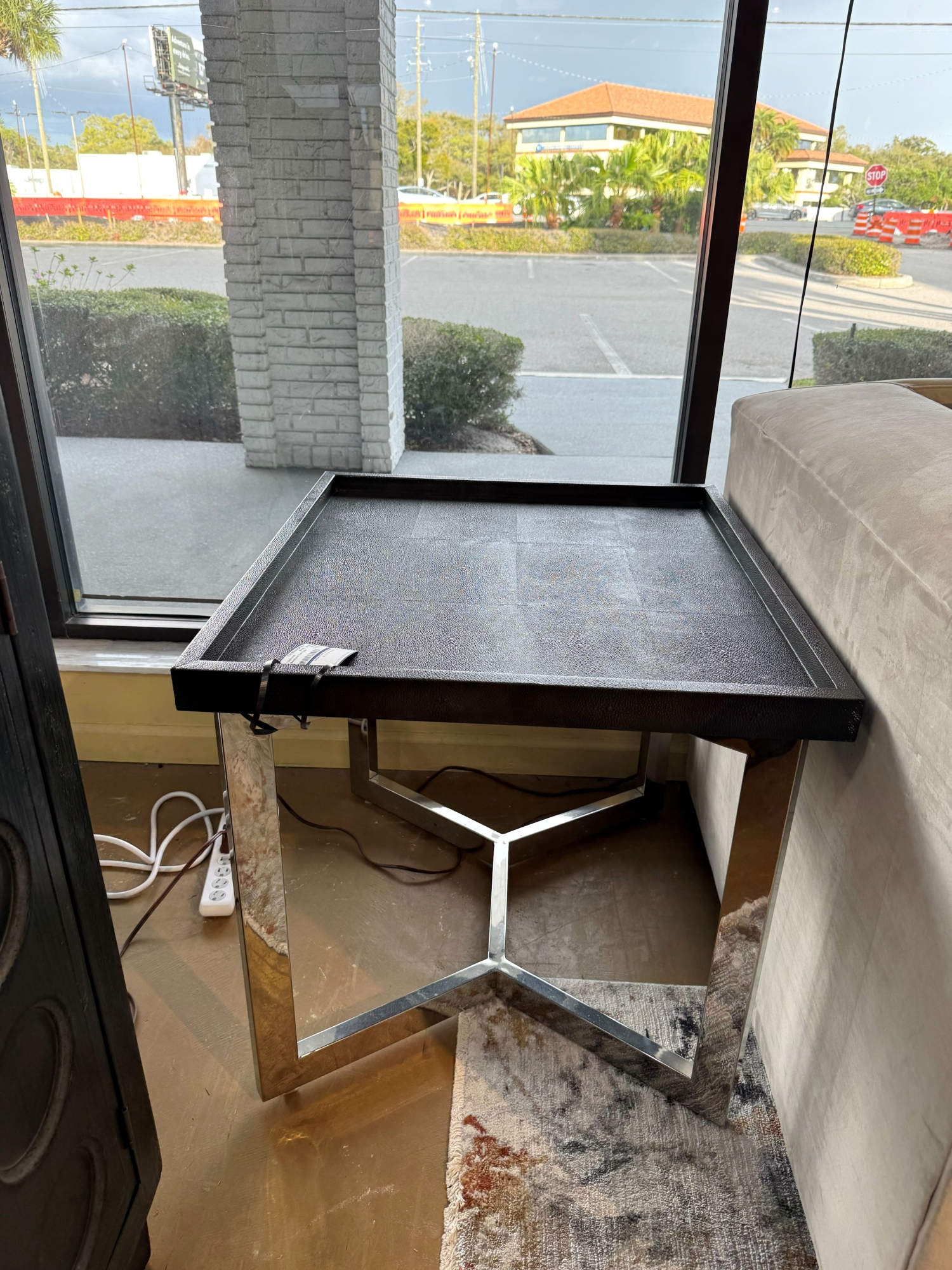Bernhardt contemporary style end table with black textured top on silver metal legs. 28"wide x 25"deep x 25"high. At posting, we have the matching coffee table.
