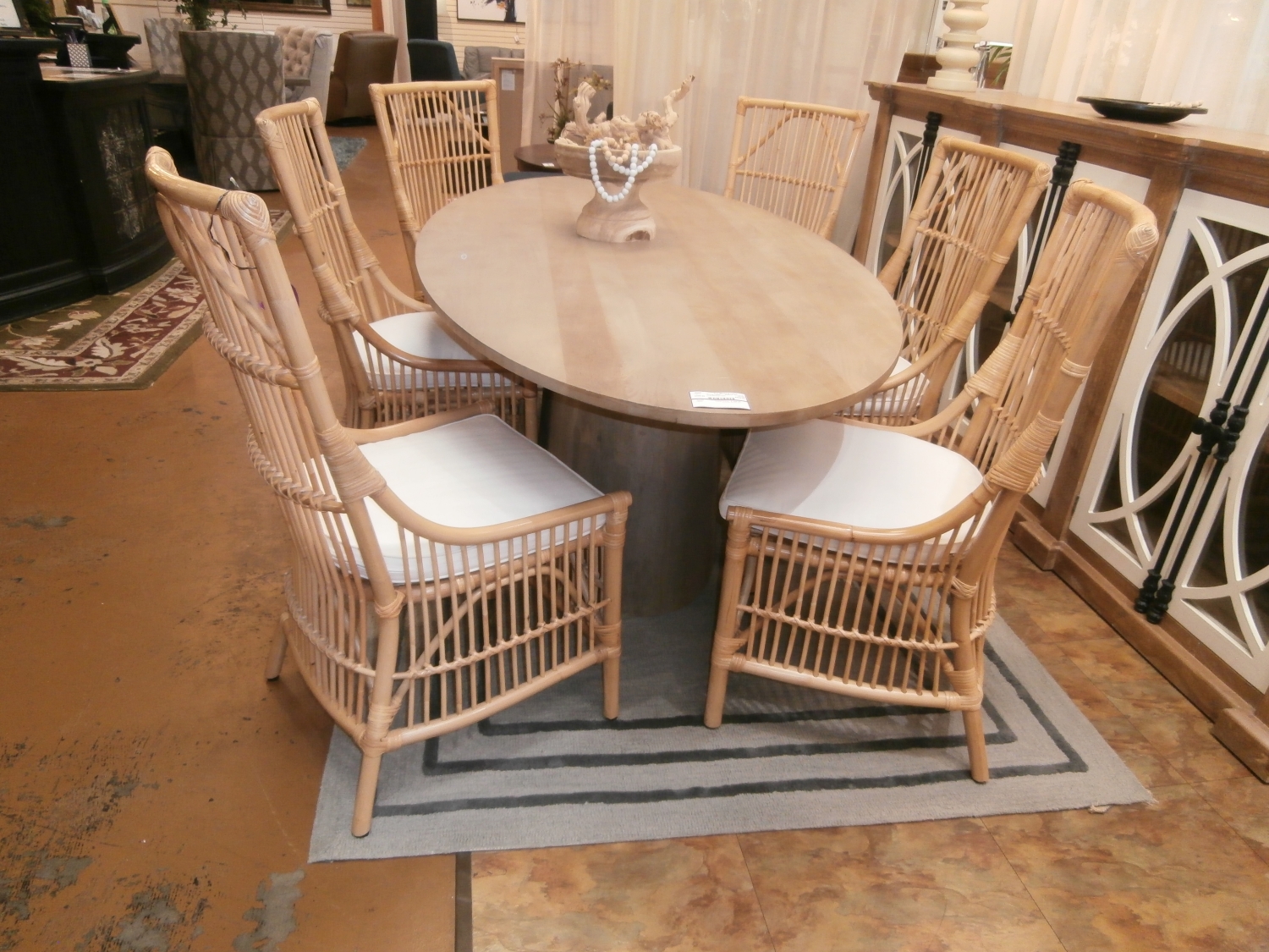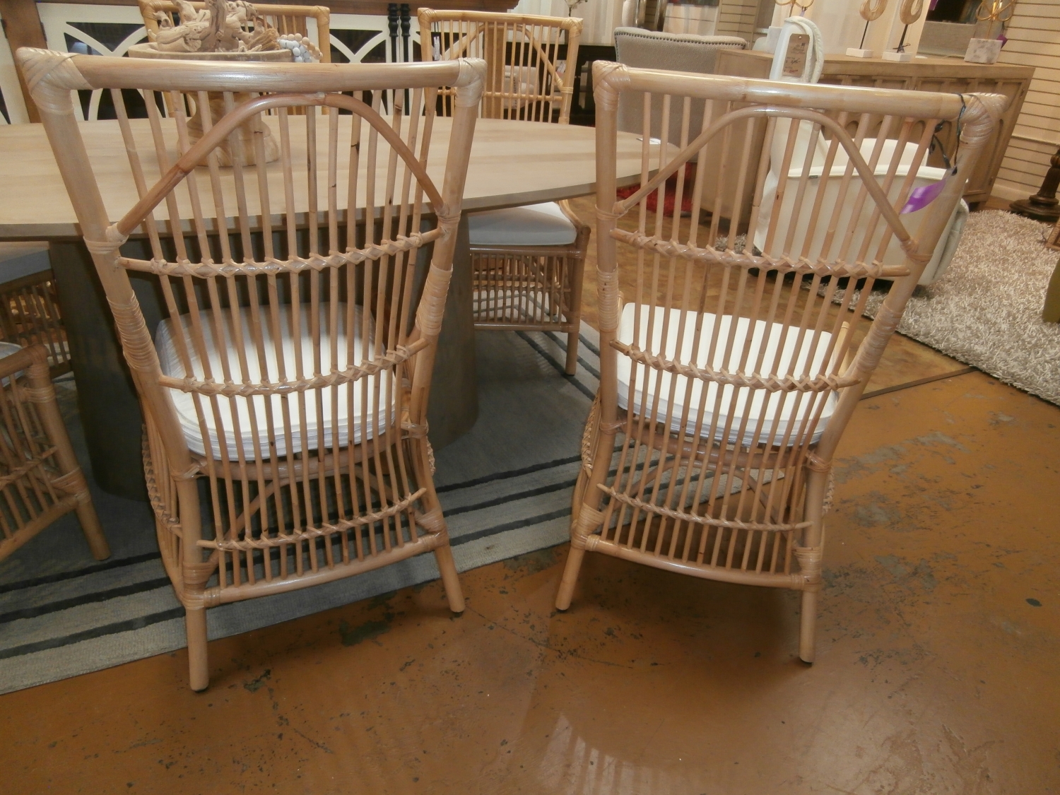 Set of six natural brown rattan cushioned chairs. Perfect for florida look.