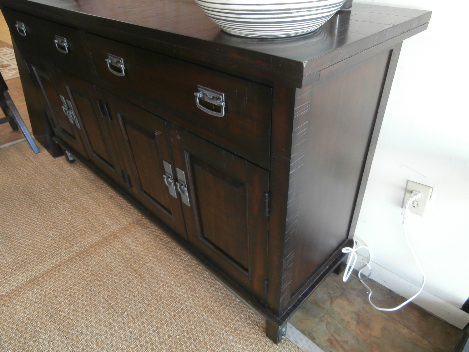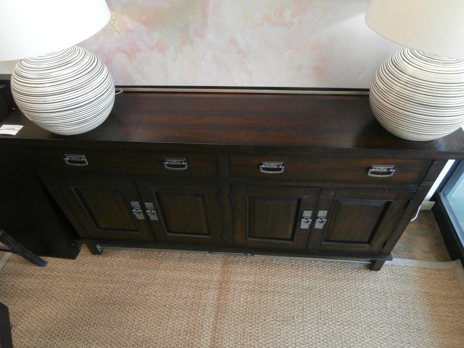 Havertys Arden Ridge rustic four drawer, four door buffet in a dark finish. The multi-step finish is distressed with cowtailing & wood knots for aged allure. Measures 70"W,19"D,39"H.