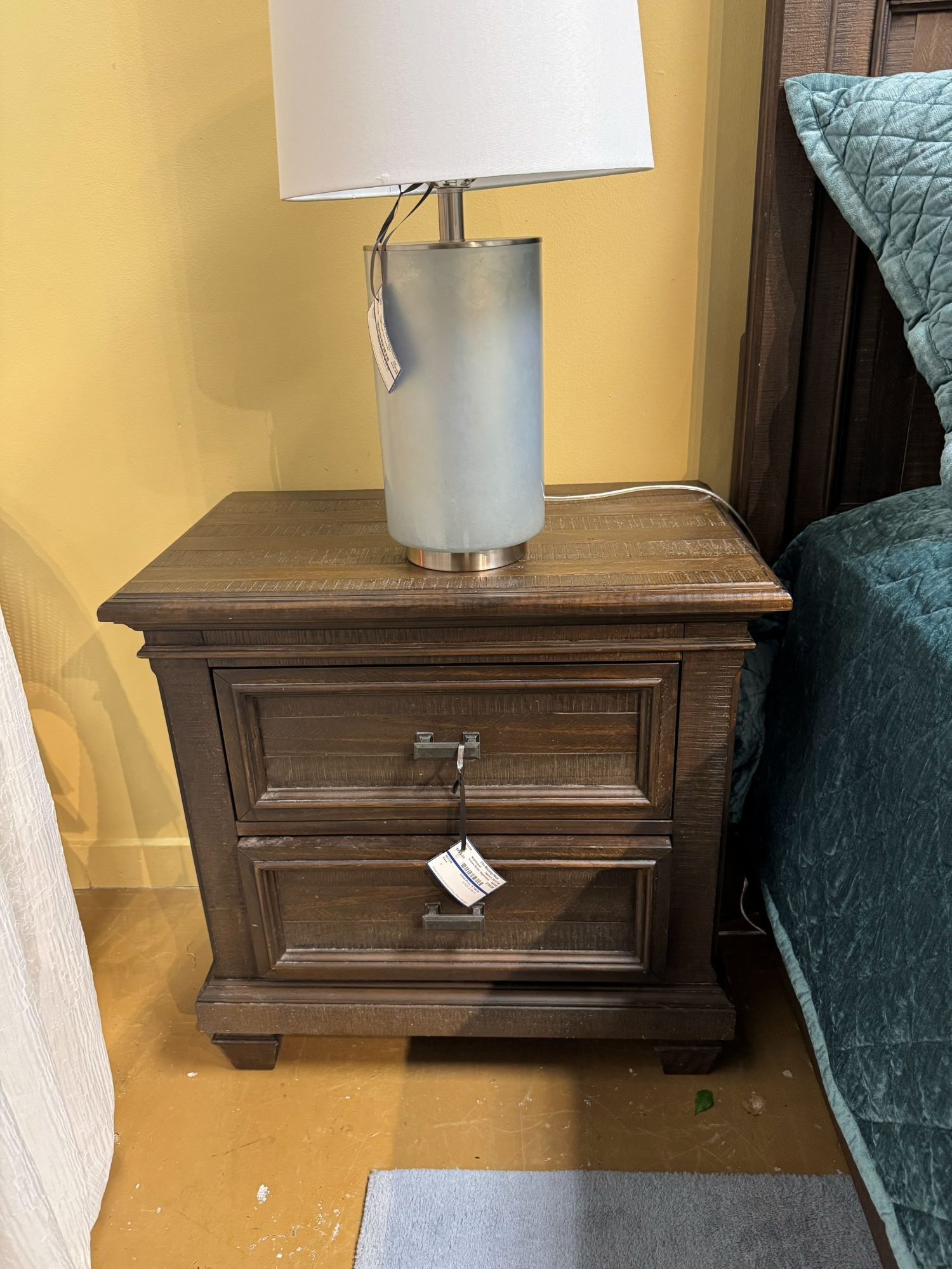 Kanes Holland House Worcester nightstand in a rustic dark finish. There are two drawers. At posting, we have the matching king bed & chest of drawers. 28"wide x 17"deep x 28"high.