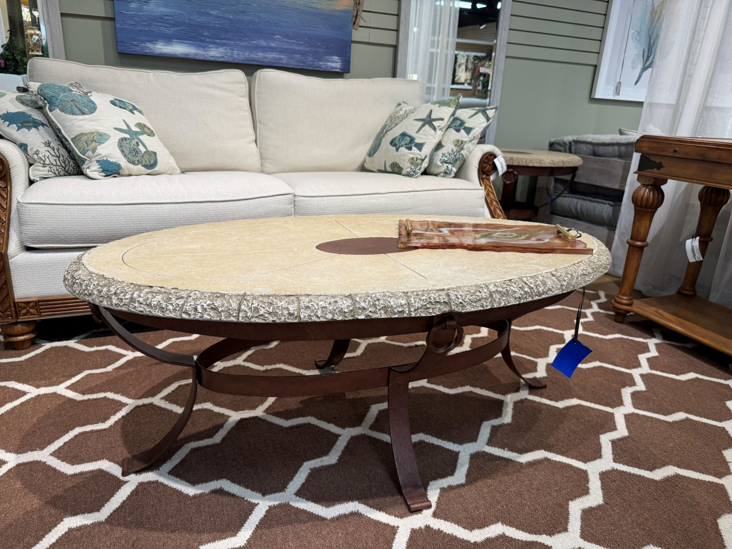 Oval shaped stone top coffee table with textured edge on bronze metal frame. 51"long x 30"wide x 20"high. At posting, we have the matching end table.