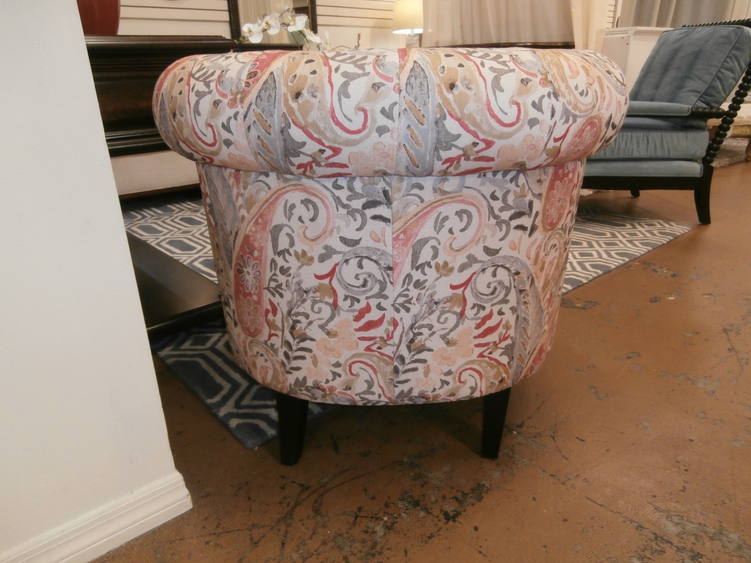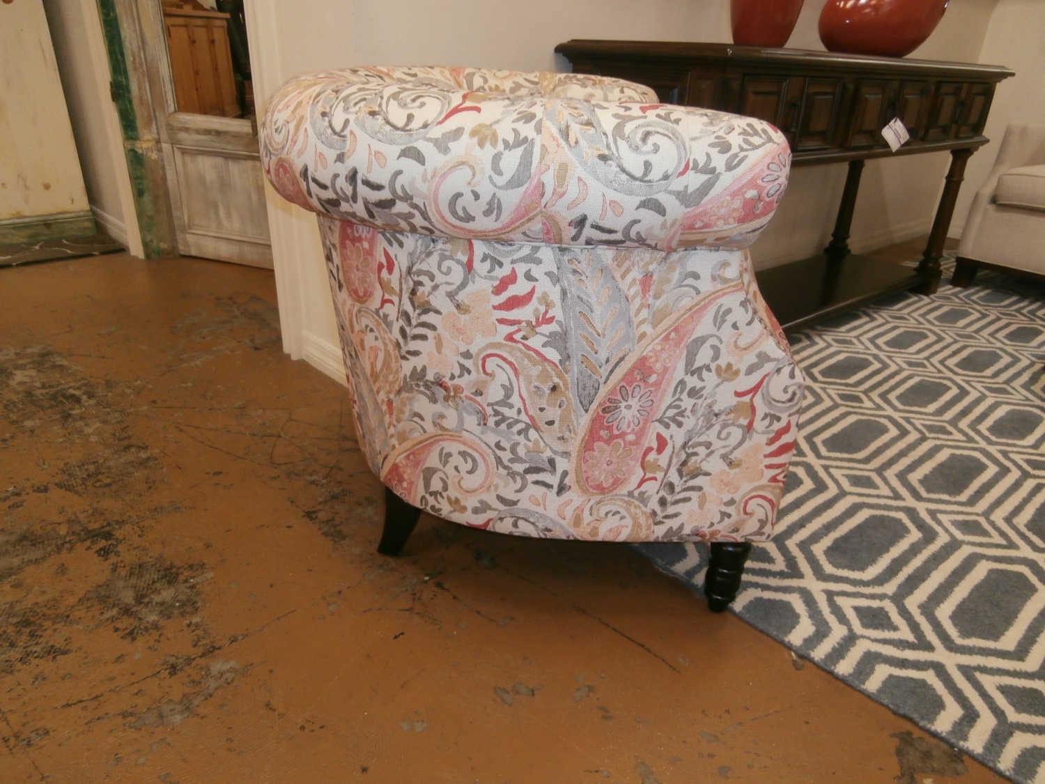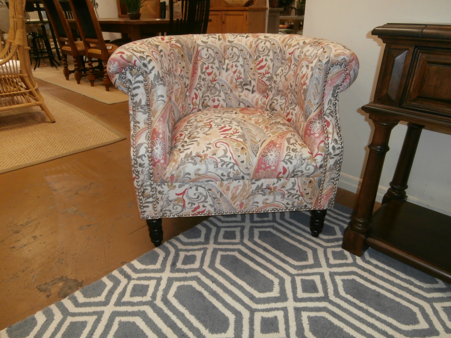 This Huntingdon chair is defined by its iconic Chesterfield silhouette and chic nailhead trim, so it's sure to infuse your room with plenty of traditional style. Measures 34"W,29"D,30"H in multi color pattern print.