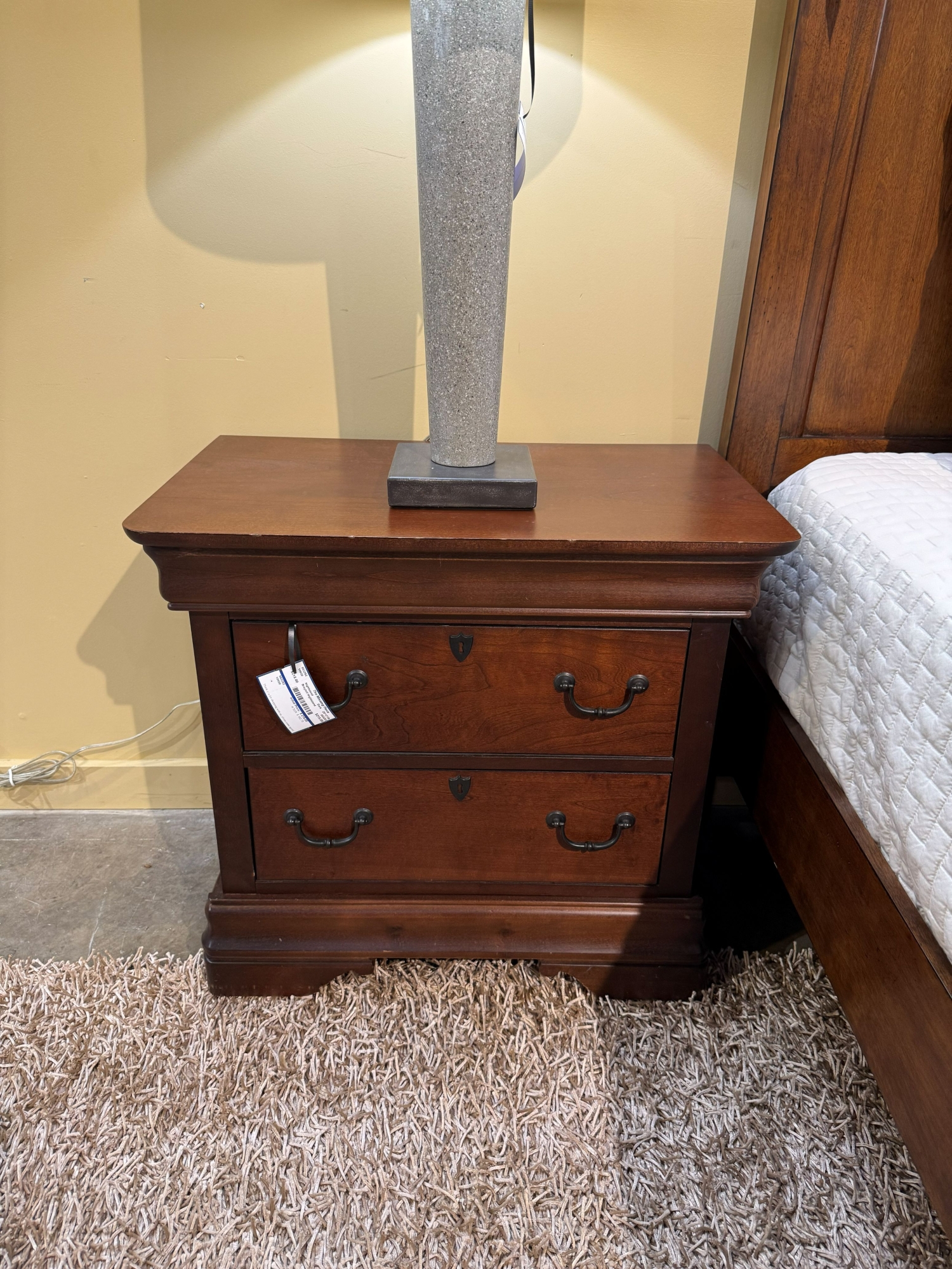 Broyhill traditional style nightstand in a rich dark finish. There are two drawers. 28"wide x 17"deep x 26"high. At posting, we have two.
