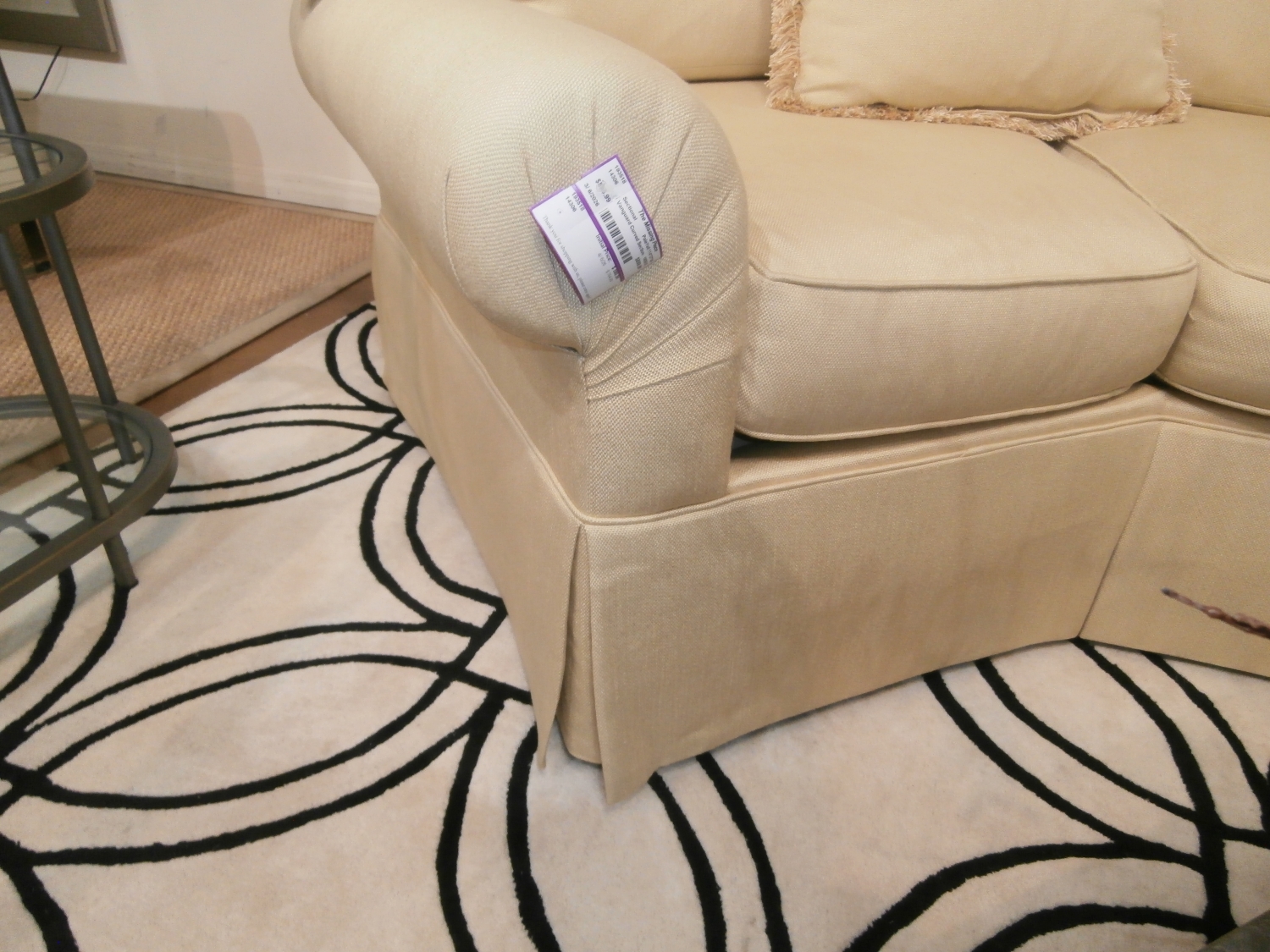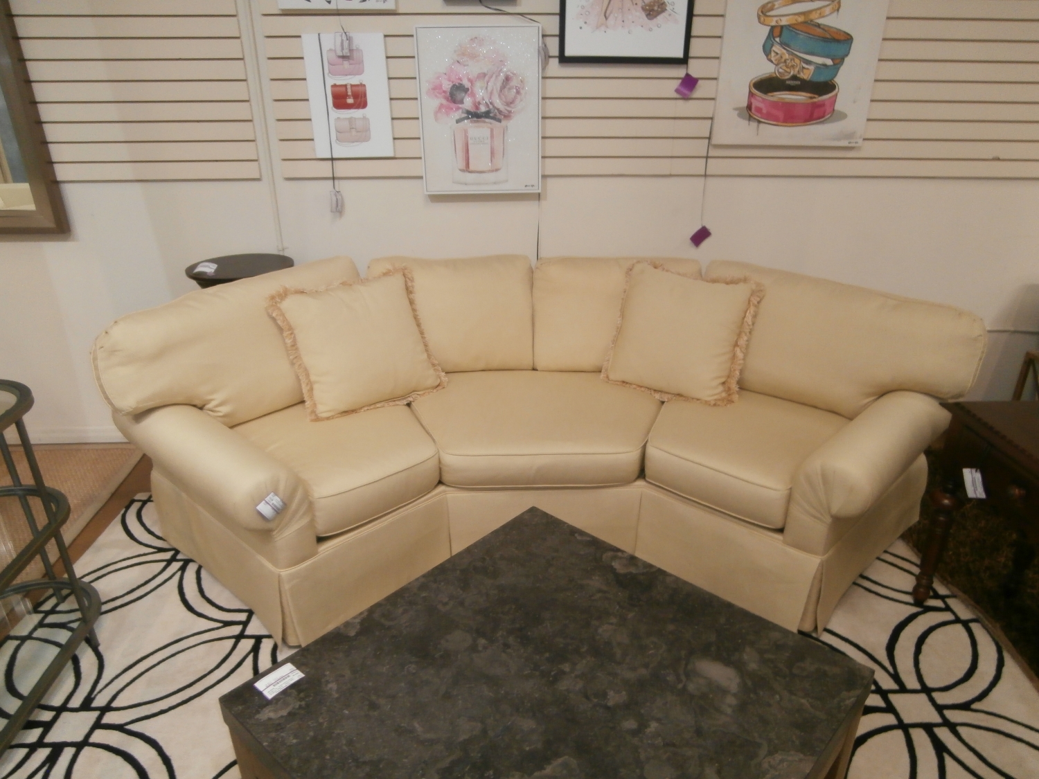 Vanguard curved sectional with rolled arms and pleated skirted bottom. Measures 114'W,37"D,36"H in pale yellow.