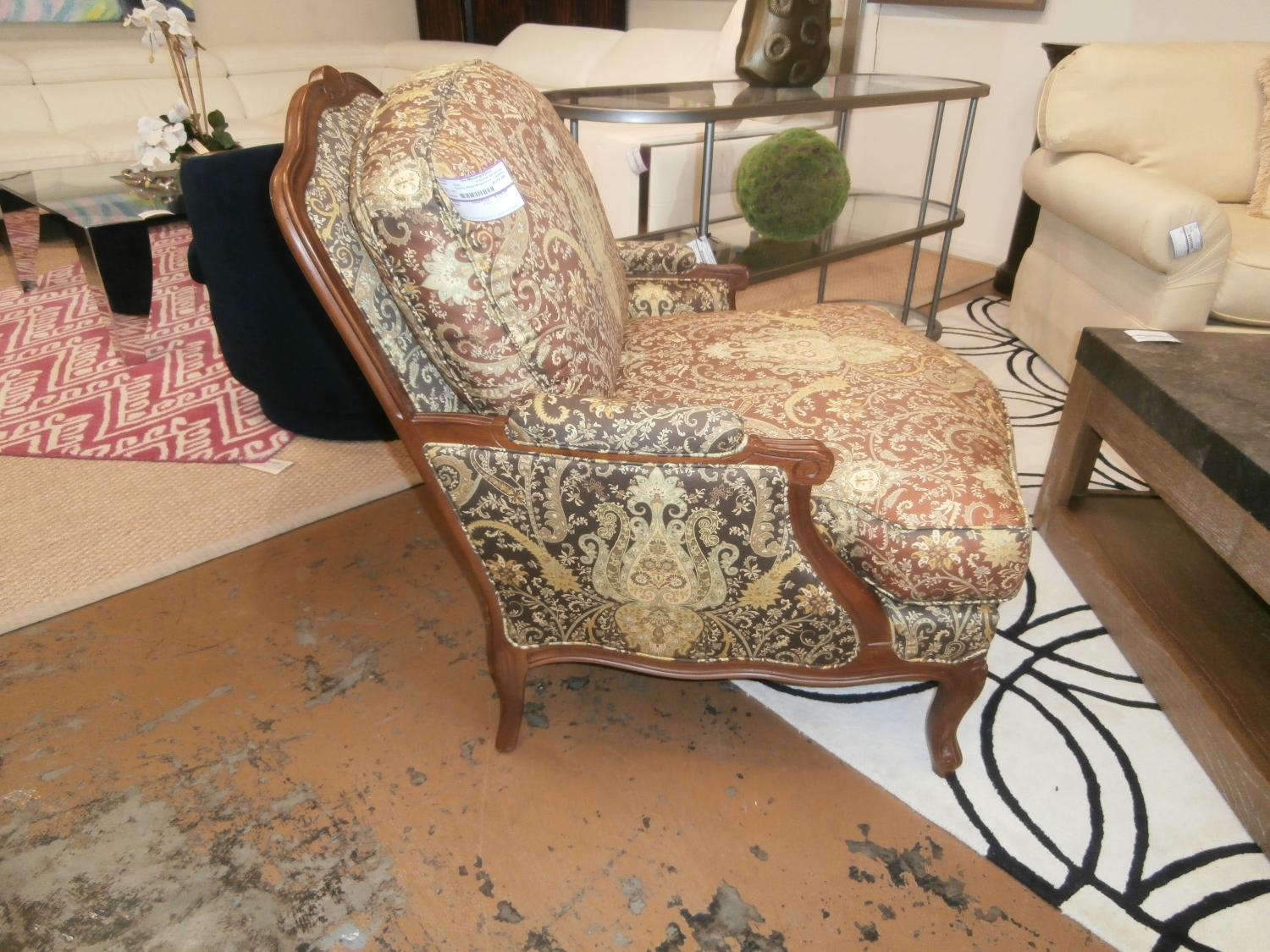 Made popular in the era of King Louis XV in France, the Bergere chair provides comfort with an elegant edge. This Hickory White piece has a fun paisley pattern. Measures 25"W,39"D,36"H in brown and gold. Two at post.