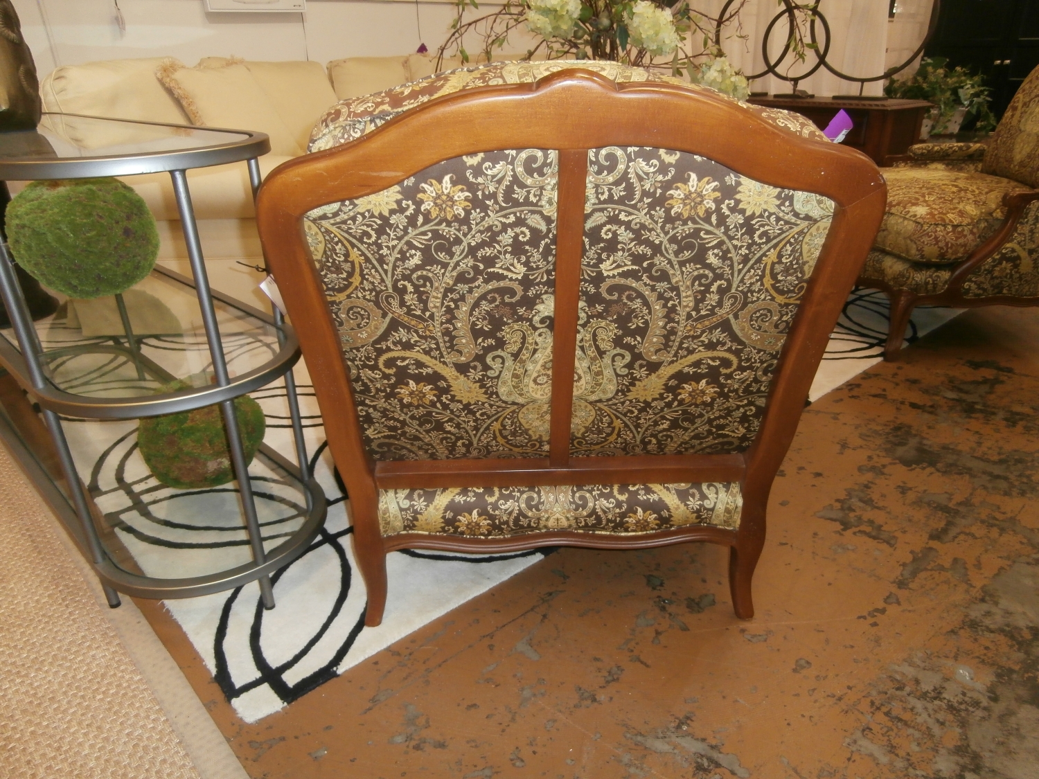Made popular in the era of King Louis XV in France, the Bergere chair provides comfort with an elegant edge. This Hickory White piece has a fun paisley pattern. Measures 25"W,39"D,36"H in brown and gold. Two at post.