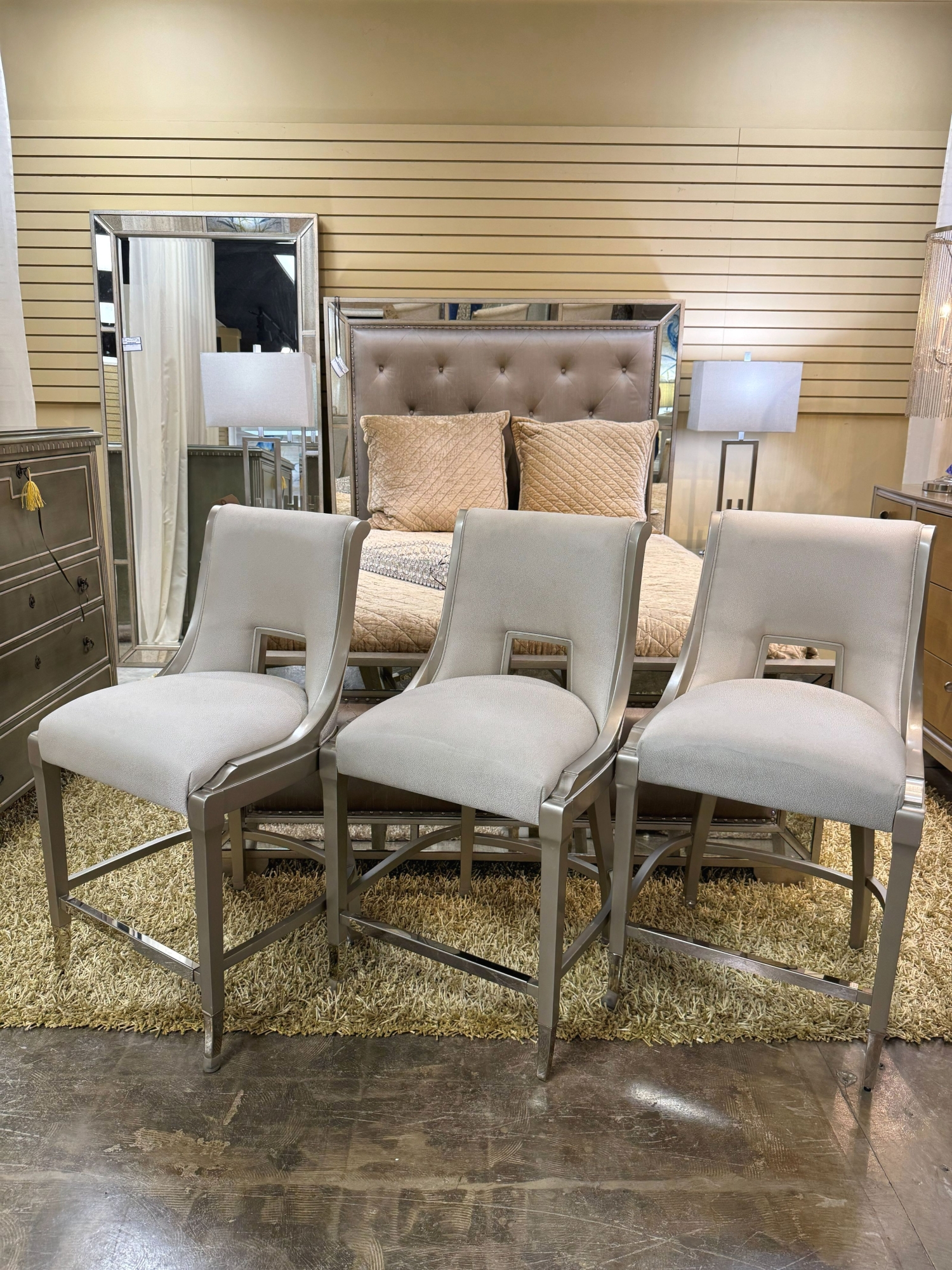 This is a pair of Caracole In Good Taste barstools in a cream patterned upholstery on champagne frame. 26"seat height.