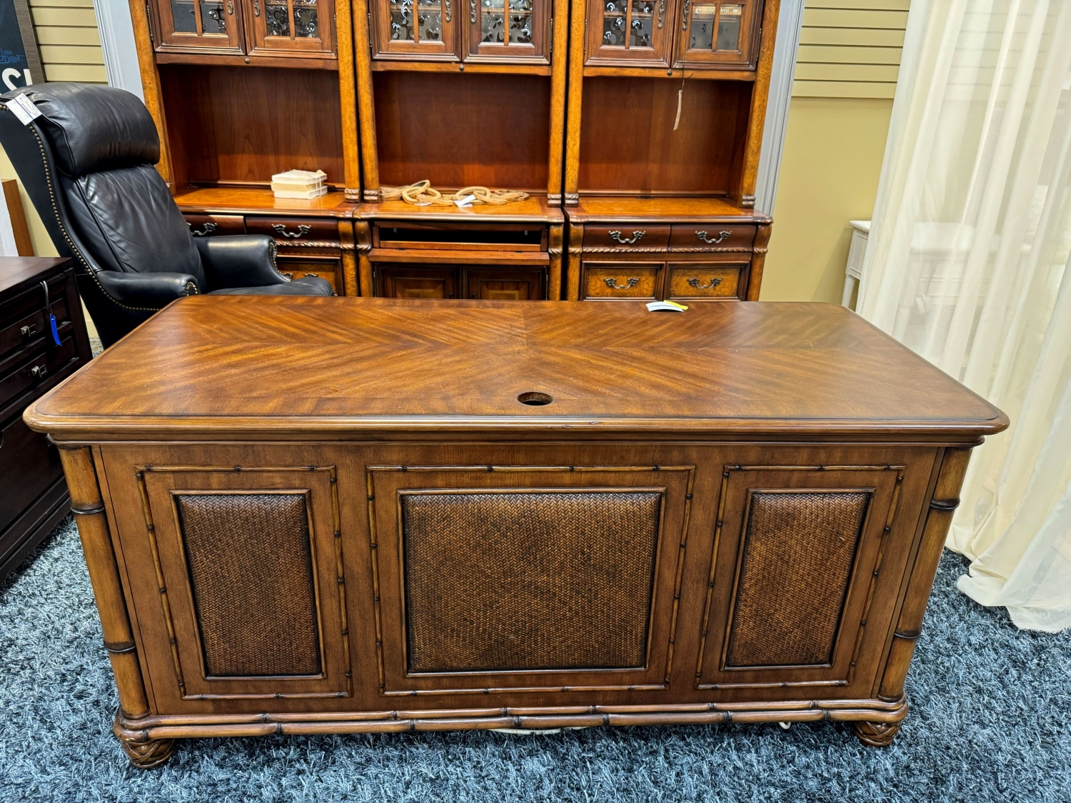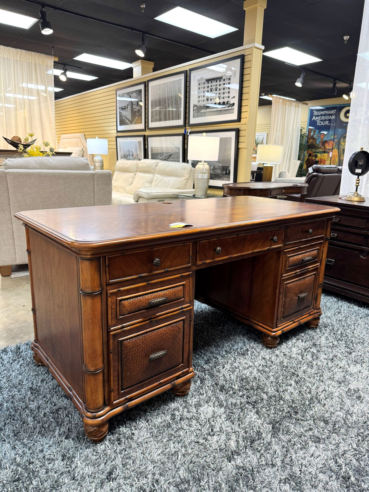 Havertys tropical style desk in a warm medium finish with woven inlaid accents. There are four drawers with one filing drawer. Measures 66"long x 30"deep x 32"high.