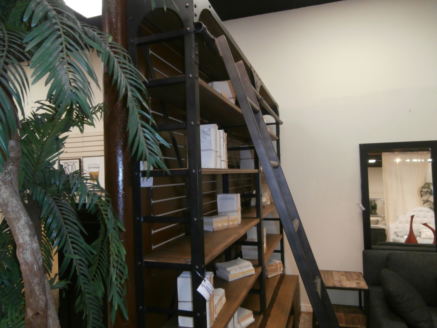 Industrial 1950s shelving that once organized tools and parts in a Dutch shipyard inspired this authentic reproduction. RH replicated the original's exposed rivets, X-back bracing and moveable ladder. 100"W,18"D,96"H