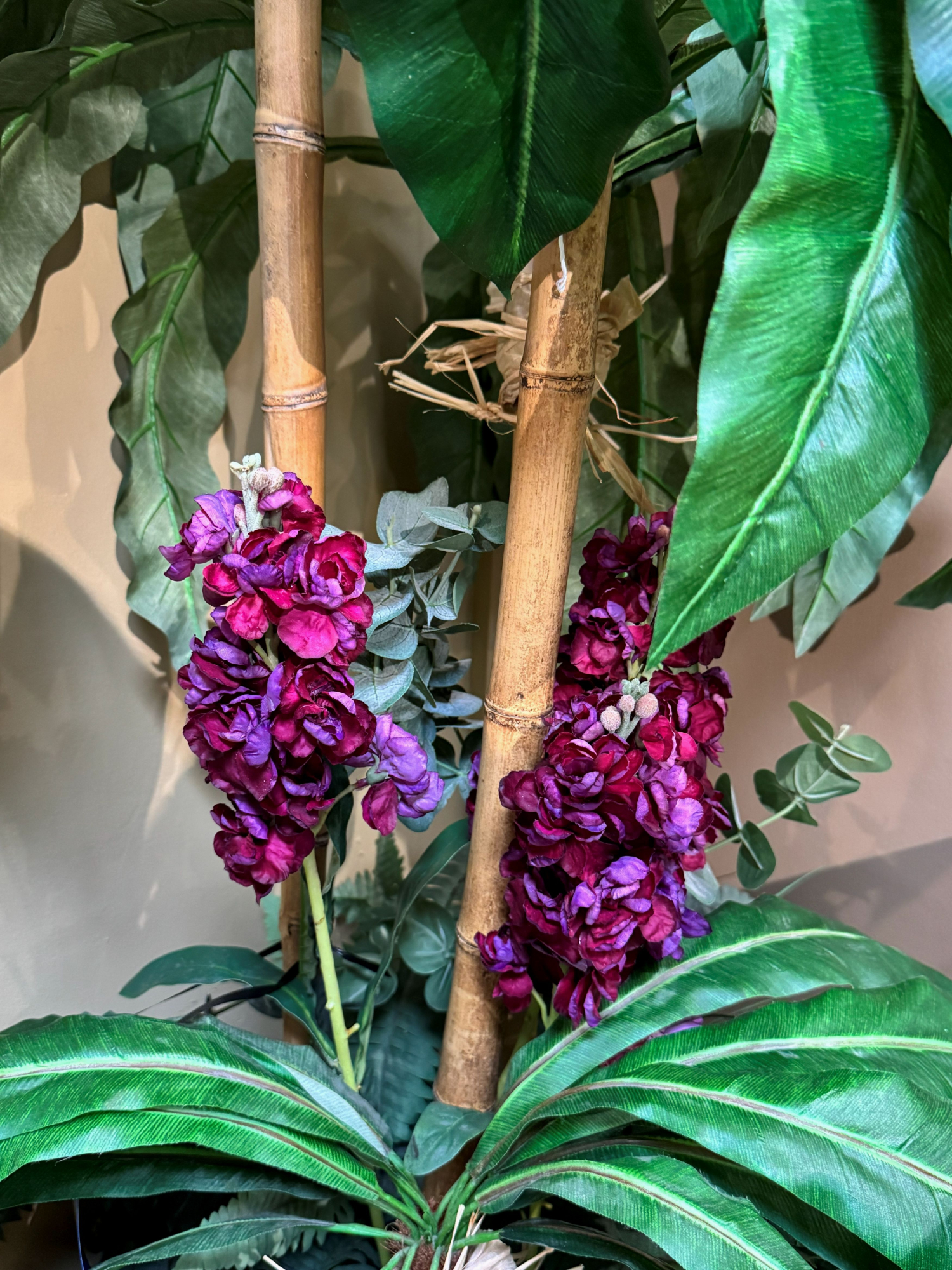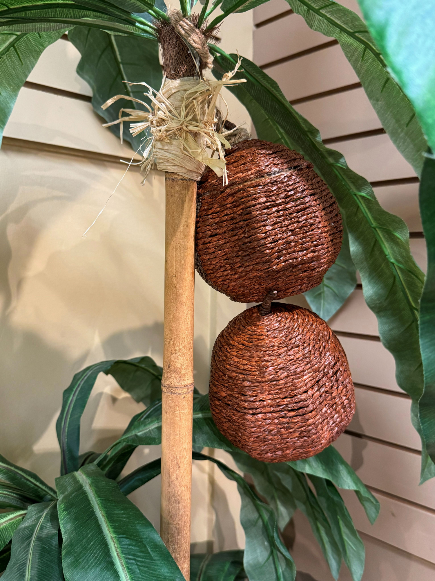 Tropical decorative tree in black basket. Love the flowers and coconuts added in for a pop of color and whimsy. 84"tall.