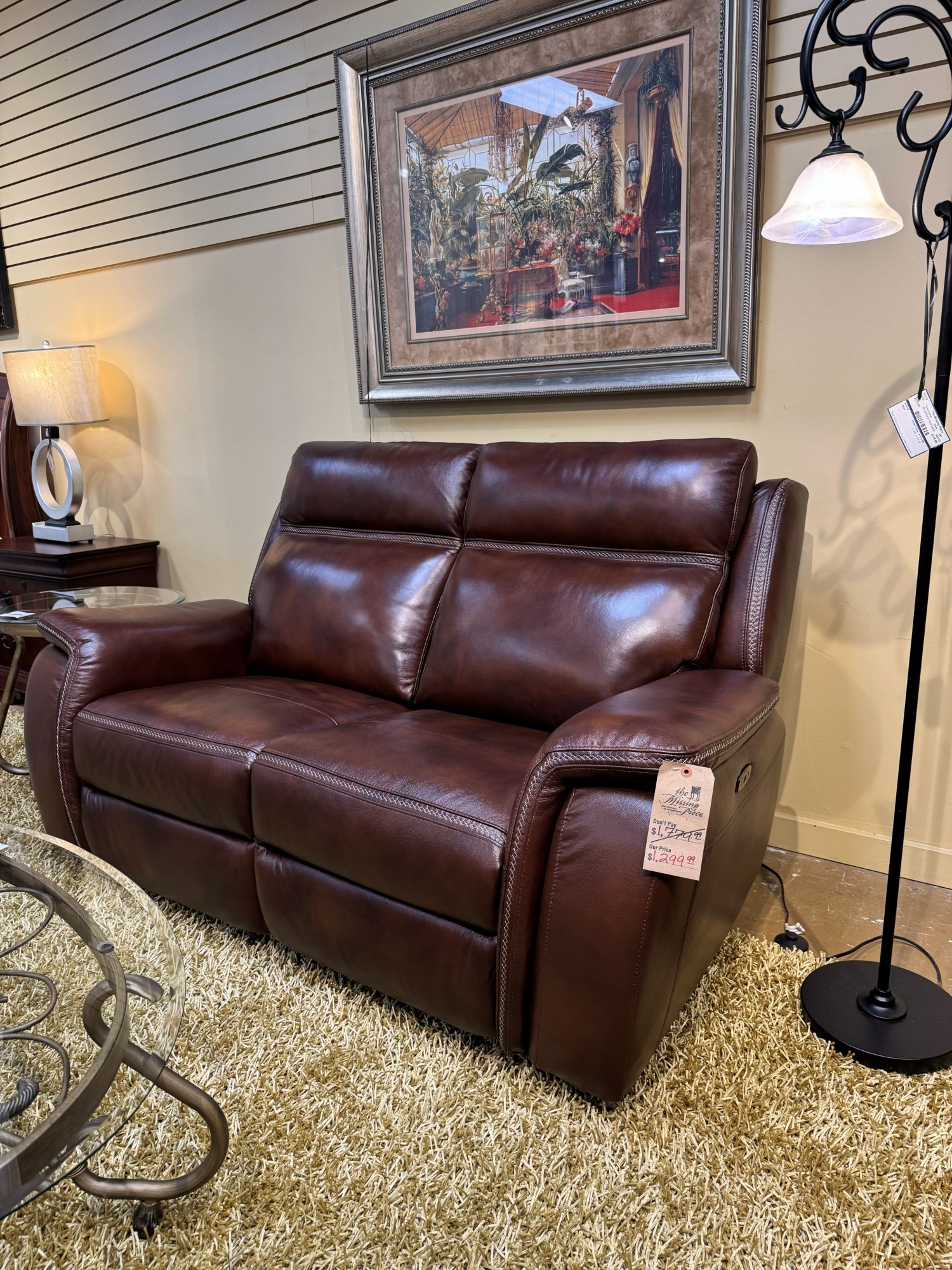 Kanes Tulare transitional style dual power reclining loveseat in a dark brown leather with contrast stitching. Ultra comfortable. 69"long x 37"deep x 42"high.