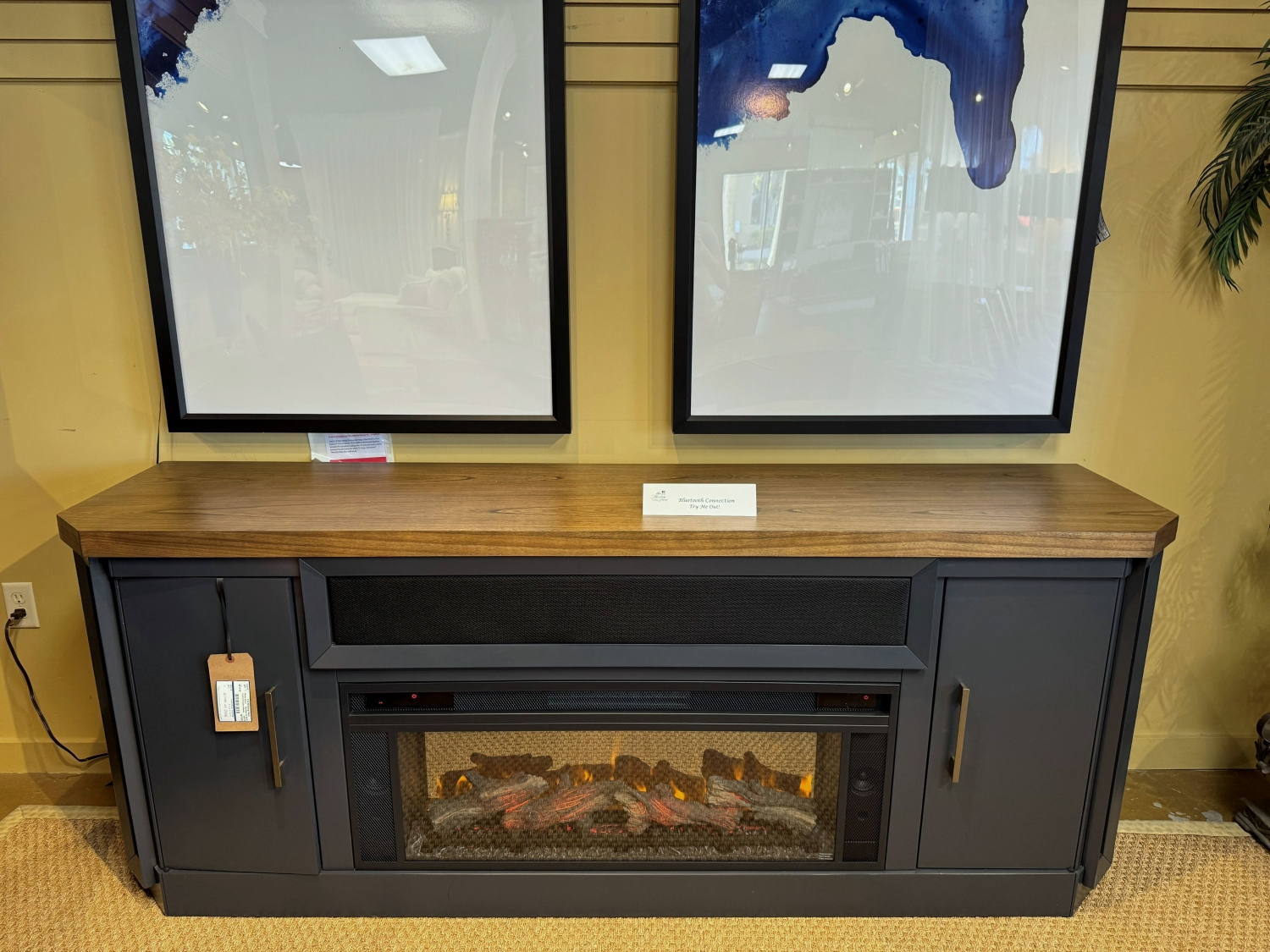 Ashley Landocken fireplace media console in a slate blue finish with wood toned top. Comes with remote. The fireplace flickers & puts off heat. Includes bluetooth connection to built in speakers. 84*20*33.