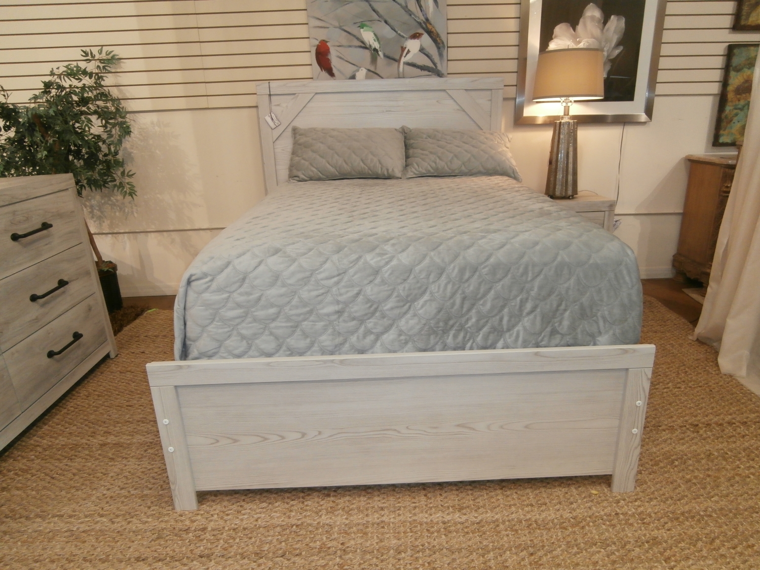 Cool, clean and casually modern. The Gerridan full panel bed’s wispy whitewash finish sets the tone for your calming sanctuary. Framed elements and cross-brace accents add dimension.