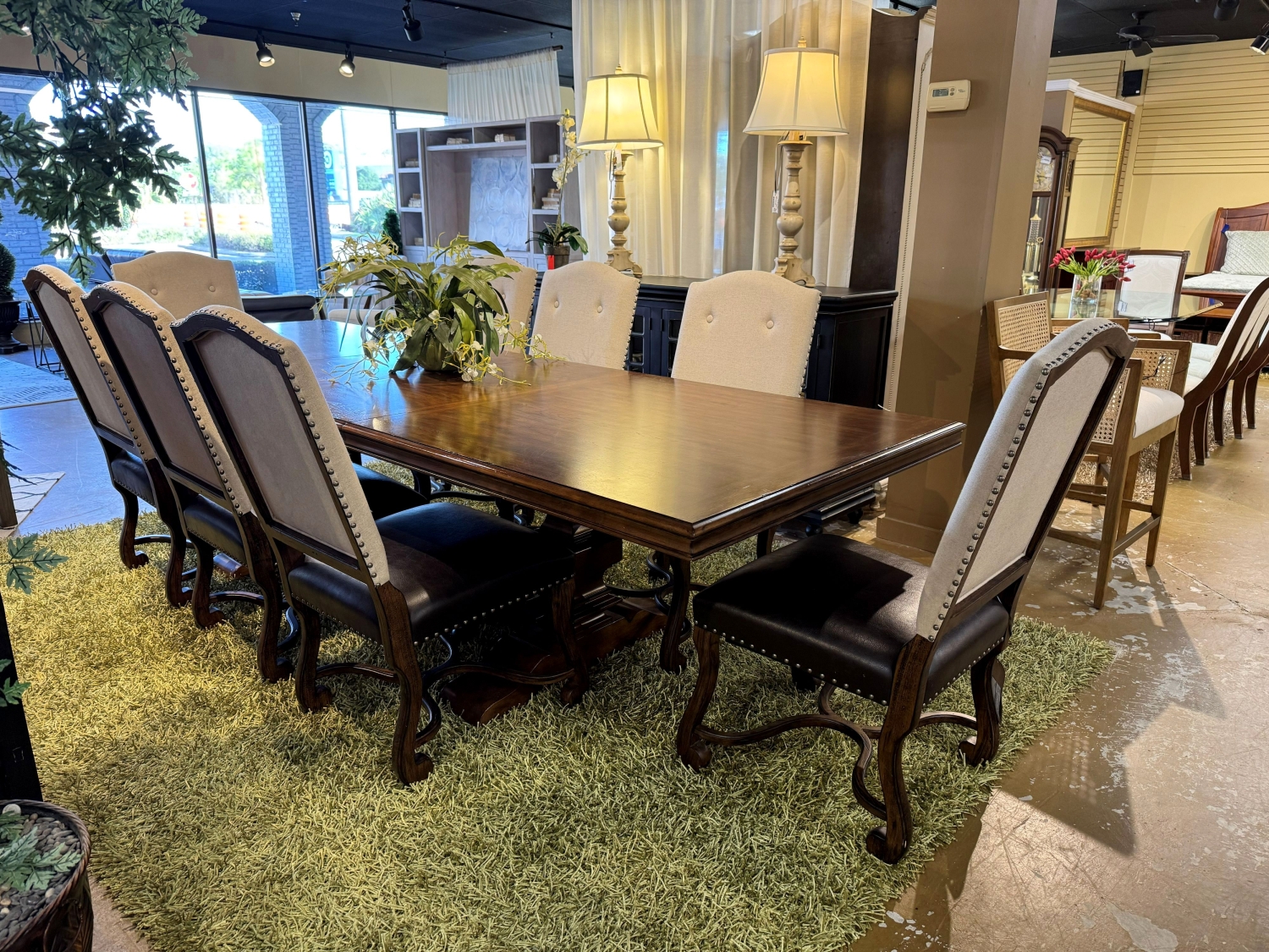 Hooker Archivist trestle dining table with eight Treviso Camelback dining chairs. The chairs have cream upholstered backs and dark leather seats with nailhead trim. 86"L x 45"W; (2)18"Lfs.