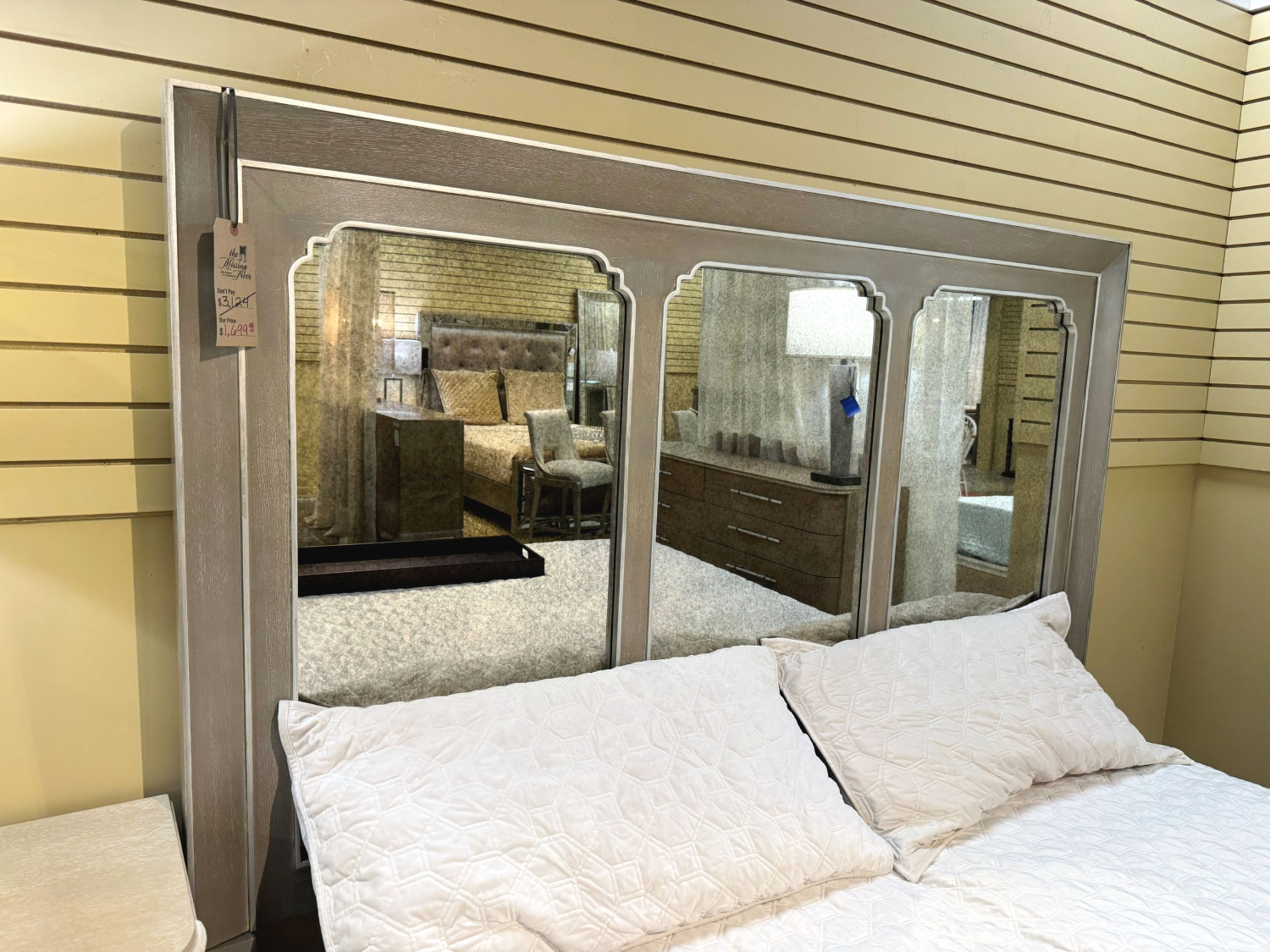Hooker Modern Romance king bed with antique mirrored panel headboard on greige wood frame with cream trim detailing. Gorgeous bed. What a focal piece for your bedroom!