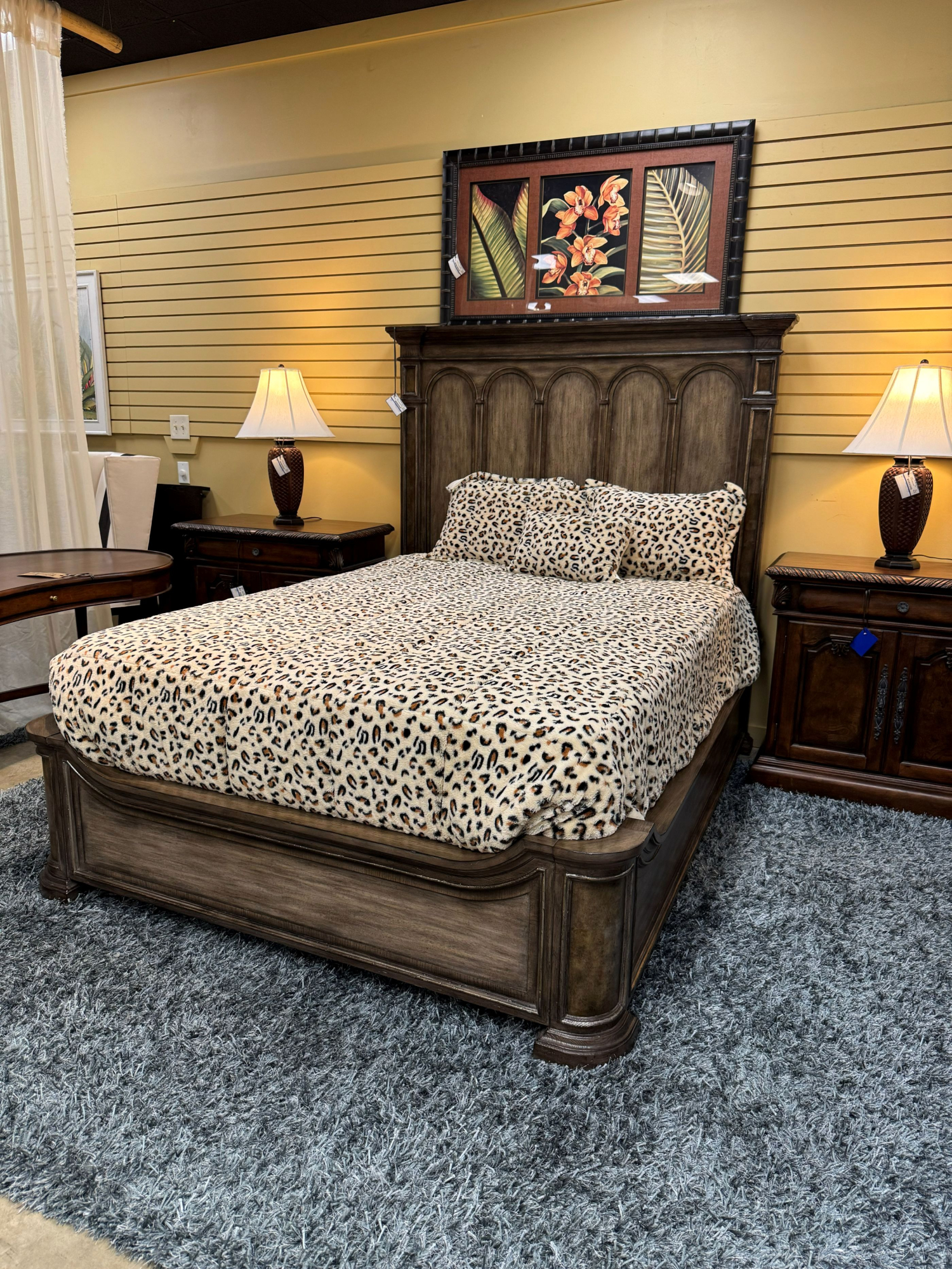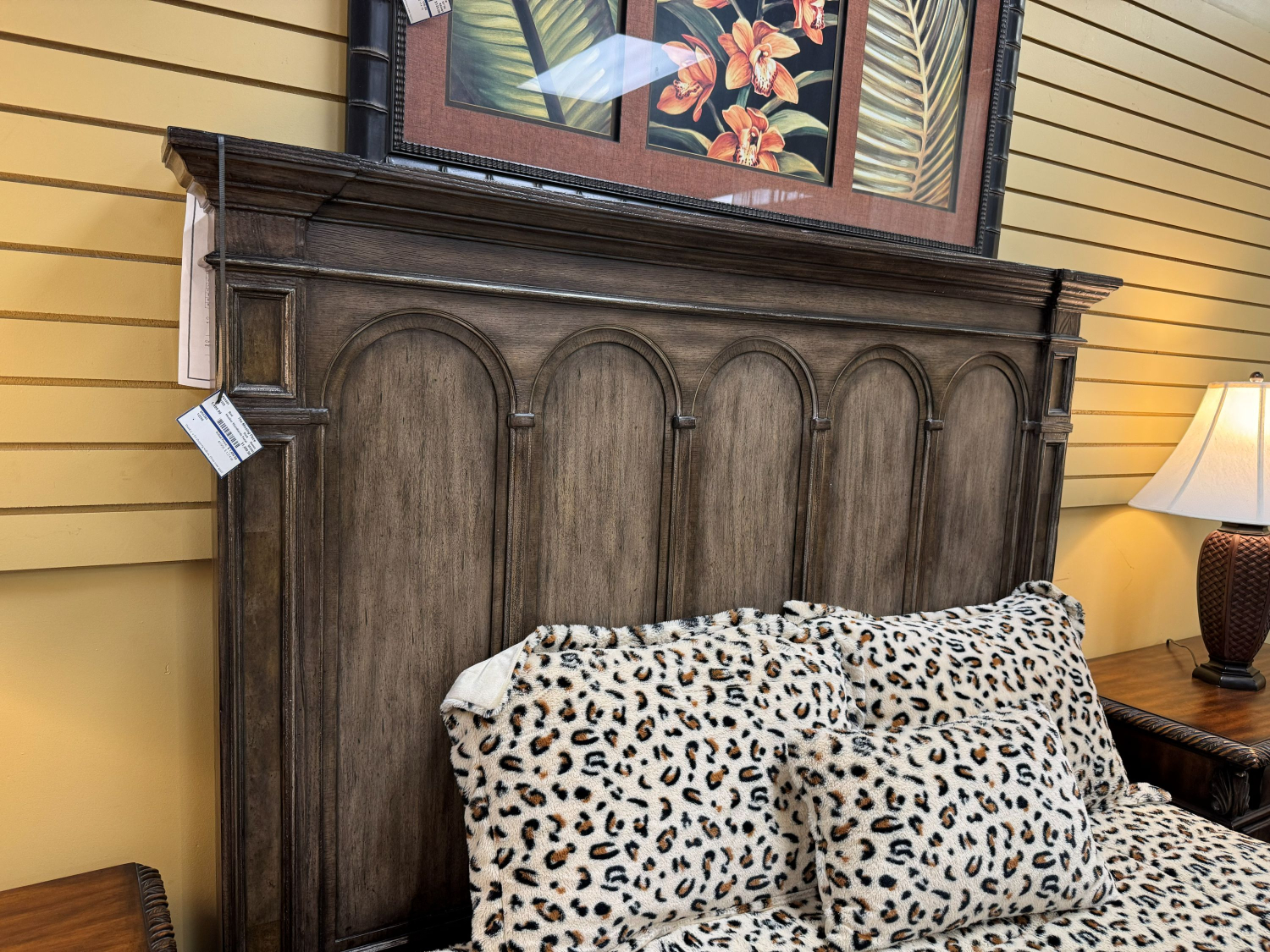 Hooker Woodlands rustic panel queen bed in a dark finish. Love the height of the headboard, gives a great silhouette.