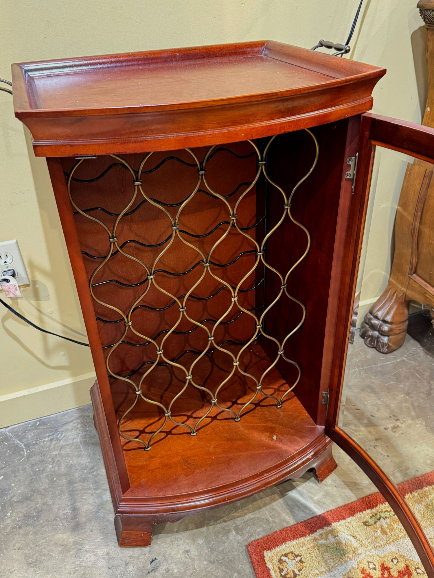 Bombay petite traditional style tray top wine cabinet in a rich dark finish. Can hold up to 16 bottles. 23"wide x 18"deep x 34"high.