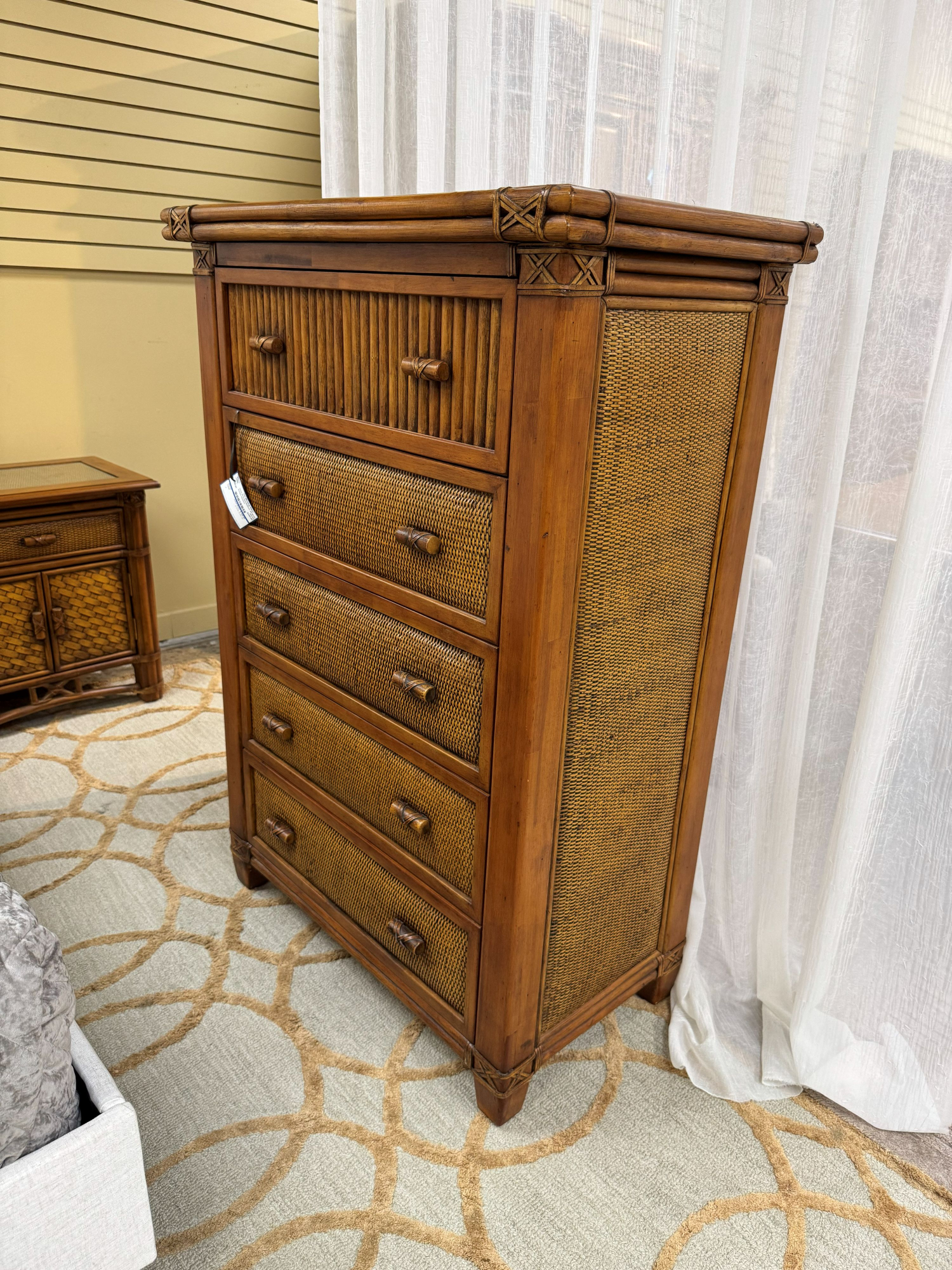 Garden Classics tropical style chest of drawers with woven accents in a warm medium finish. There are five drawers. At posting, we have the matching nightstand. 36"wide x 20"deep x 53"high.
