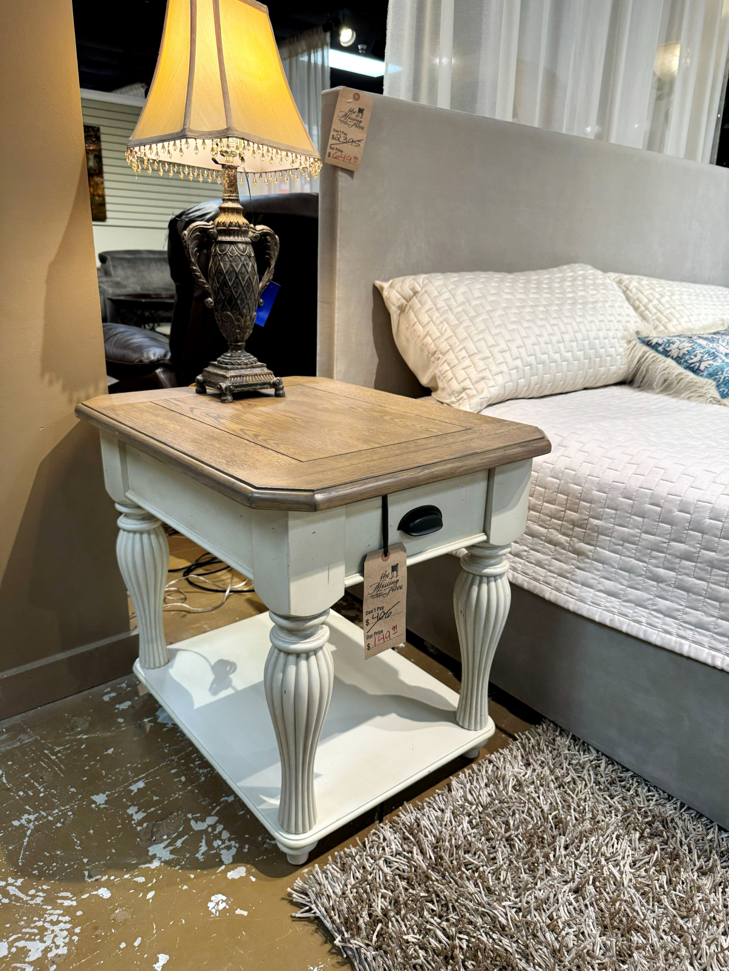 Riverside Coventry coastal style end table with light wood toned top on painted cream base. There is one drawer with a shelf below. At posting, we have the matching coffee table. 22"W x 28"D x 25"H.