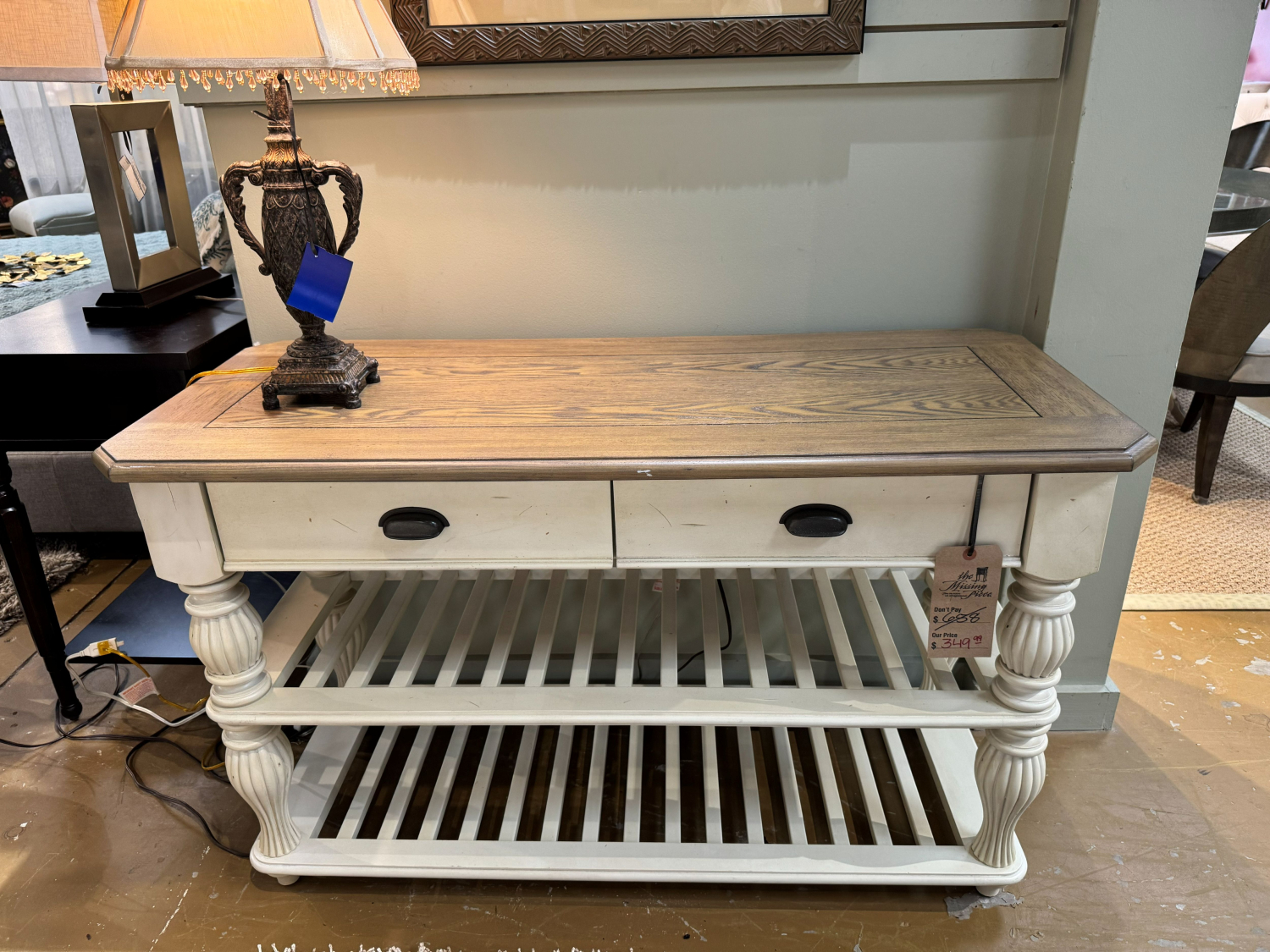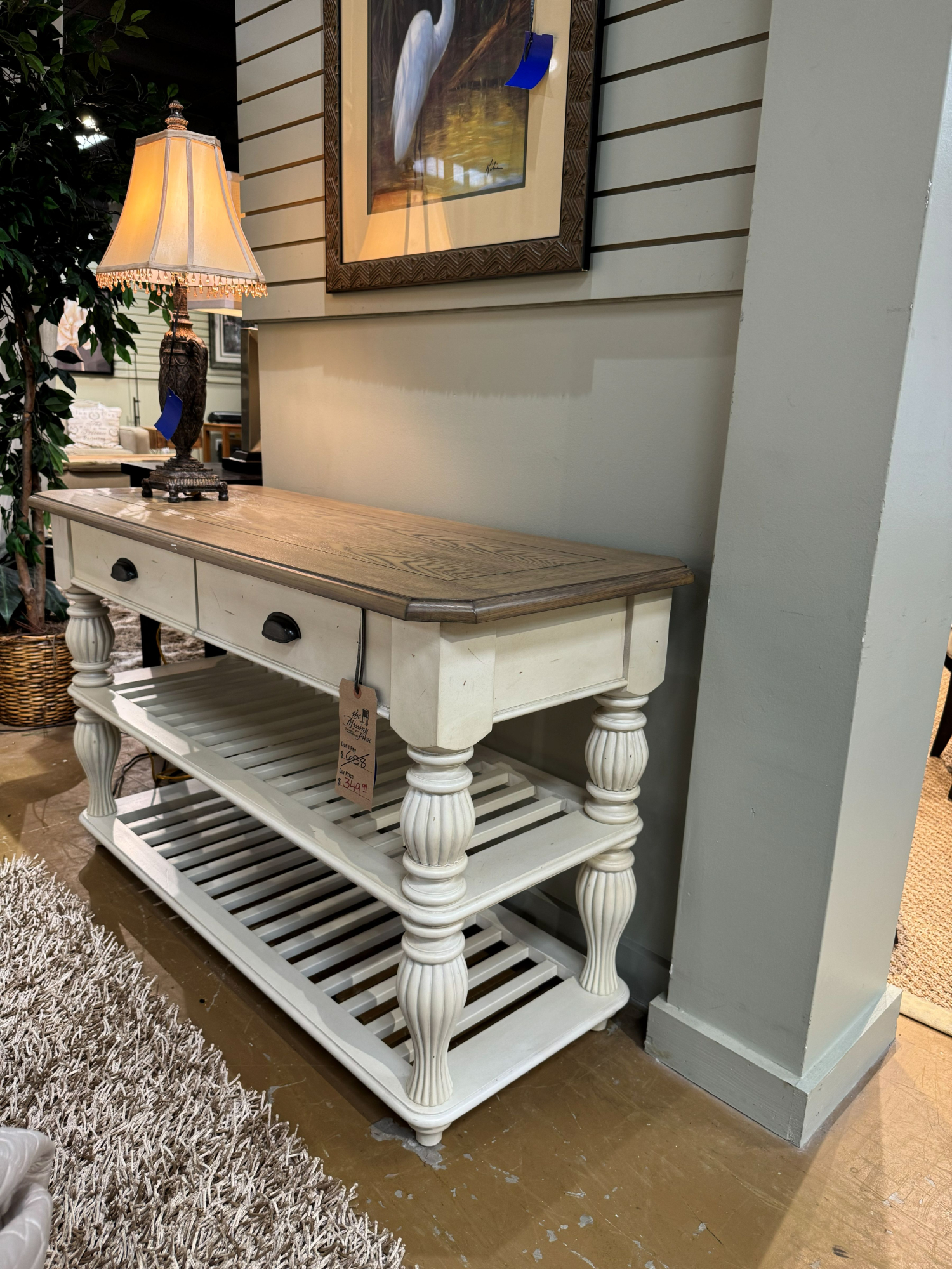 Riverside Coventry coastal style console table with light wood toned top on painted cream base. There are two drawers with two shelves below. At posting, we have the matching end table. 50"L x 21"D x 30"H.