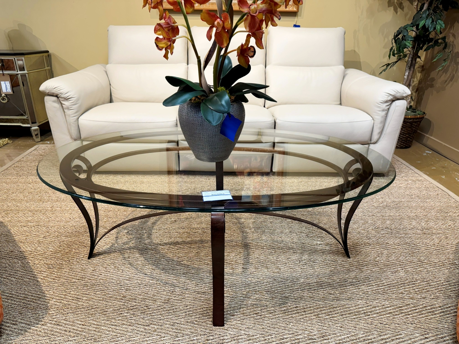 Transitional style oval glass top coffee table on dark metal legs. 52"long x 34"wide x 19"high