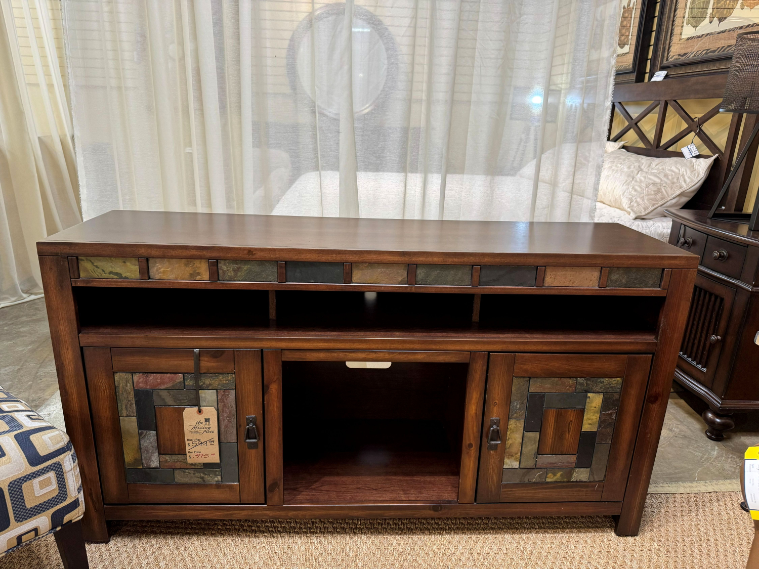 Rooms To Go Bartlett rustic media console in a dark finish with tile accents. There is open cubby space above with a shelf behind each door below. 60"long x 17"deep x 33"high.