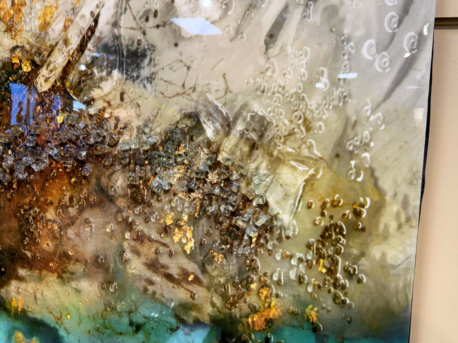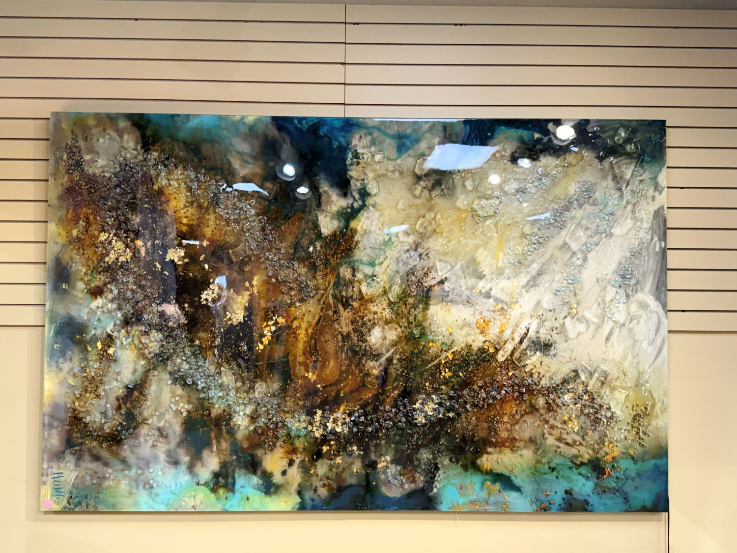 John Richard Mary Hong Cosmic art. The deep, beautiful hues & broken glass embedded in a high-gloss vitreous finish make each piece one of a kind. Stunning! Shows beautifully in person. 88”long x 57”wide.