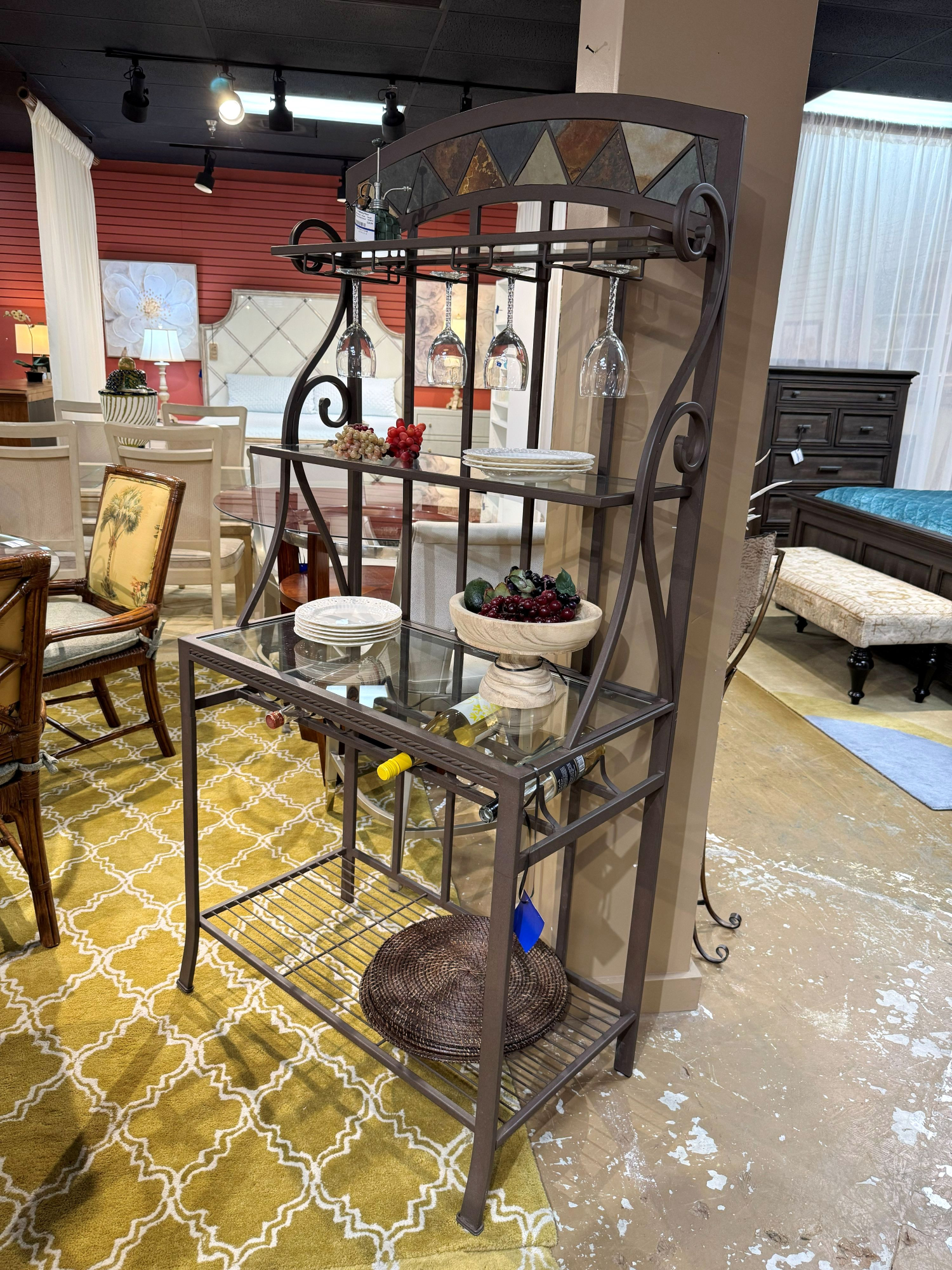 Metal and glass bakers rack in a dark finish. There are three shelves with glass and bottle storage. Great for a kitchen or more casual dining area. 35"wide x 18"deep x 72"high.