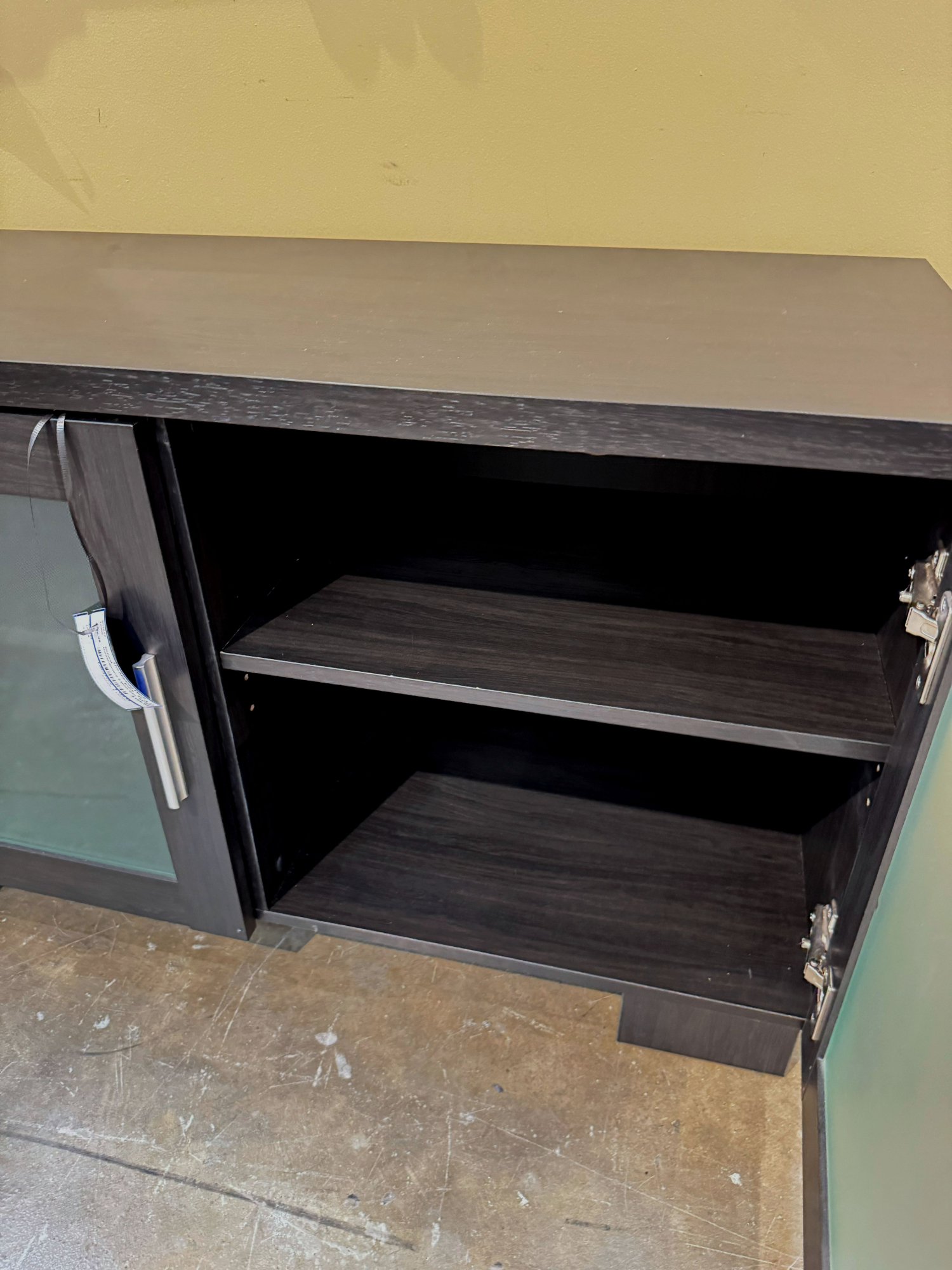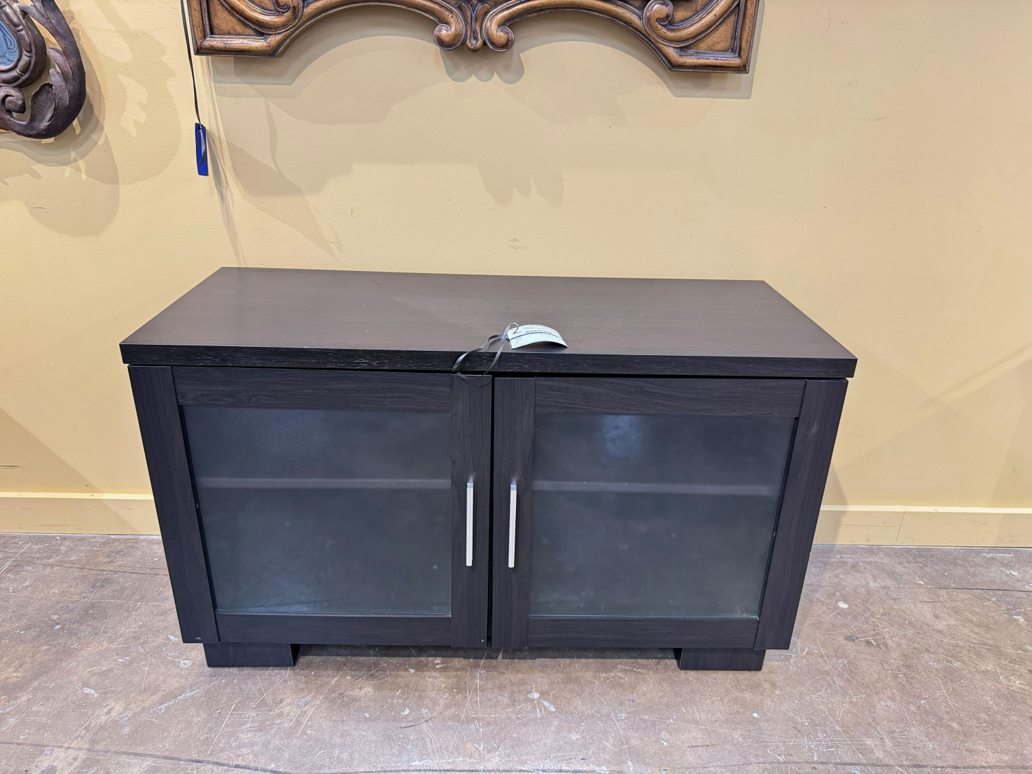 Contemporary style two door cabinet in an ash black. There is one shelf behind each glass door. 40”long x 16”deep x 24”high.
