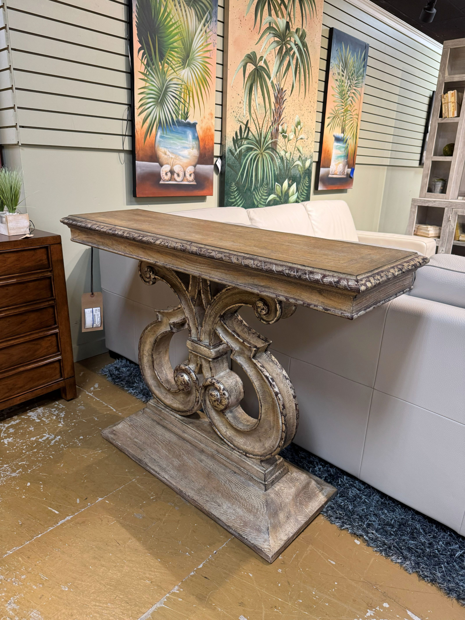 Beautiful Hooker Solana console table on ornate base in a weathered oak finish. 48"long x 14"deep x 34"high.