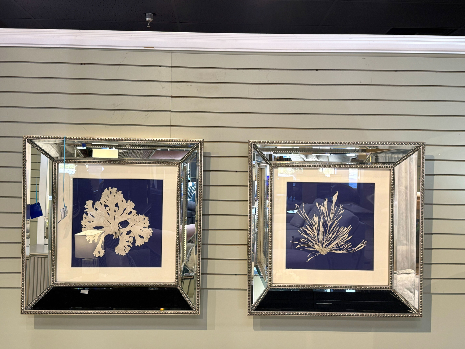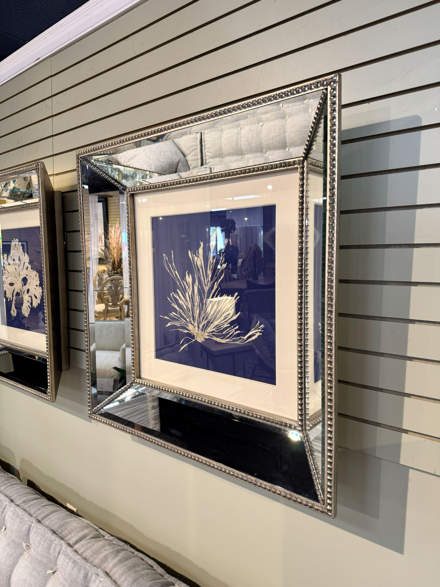 This is a pair of John Richard coastal art in blue and white with thick mirrored frame. The light reflects beautifully against the mirrored frame. Each measures 34”wide x 6”deep x 34”high.