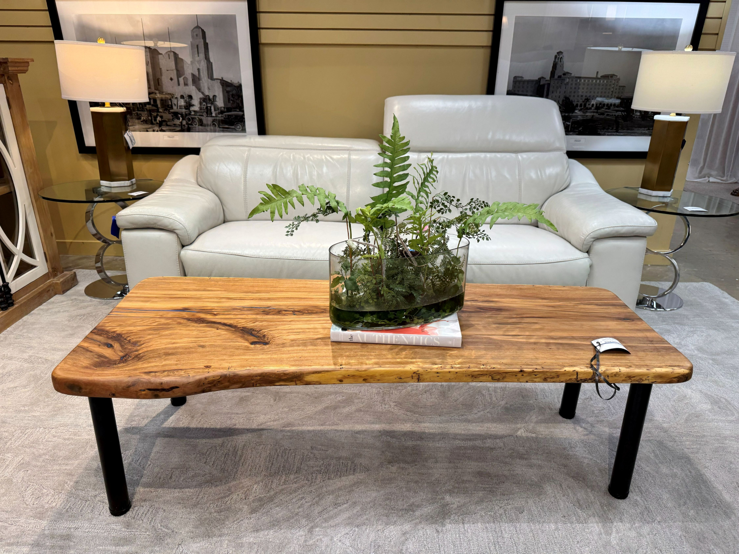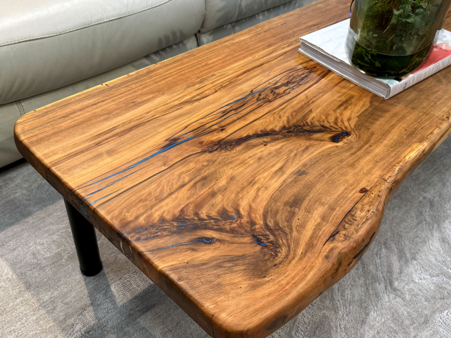 Custom free form sweetgum wood coffee table with subtle blue accents on black metal legs. Perfect for a rustic or industrial style home. 60"long x 21"deep x 18"high.