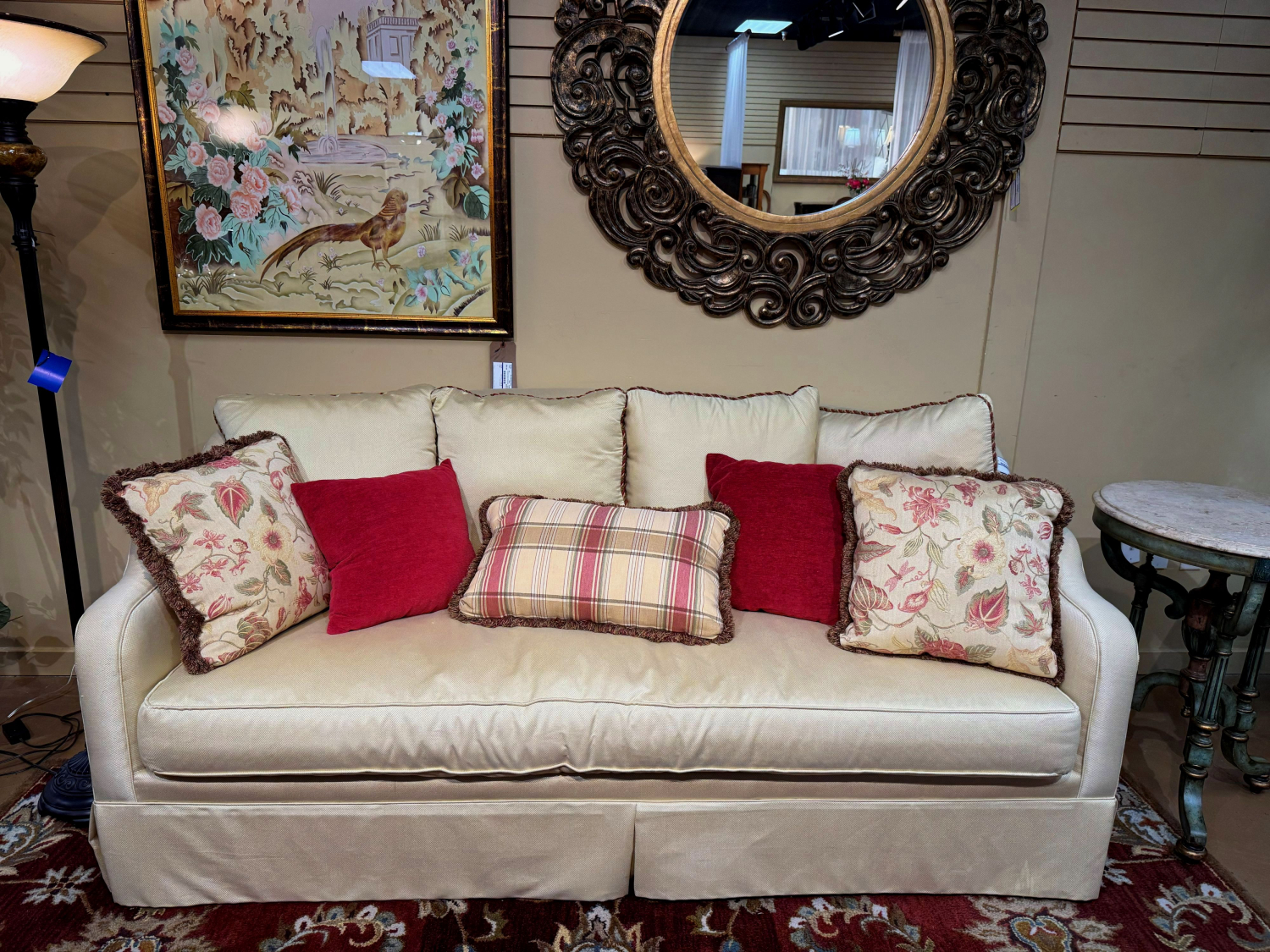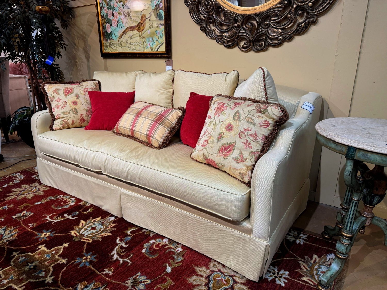Jordan Alexander single cushion pillow back skirted sofa in a soft maize upholstery. Ultra comfortable. Includes accent pillows. 89”long x 42”deep x 40”high.