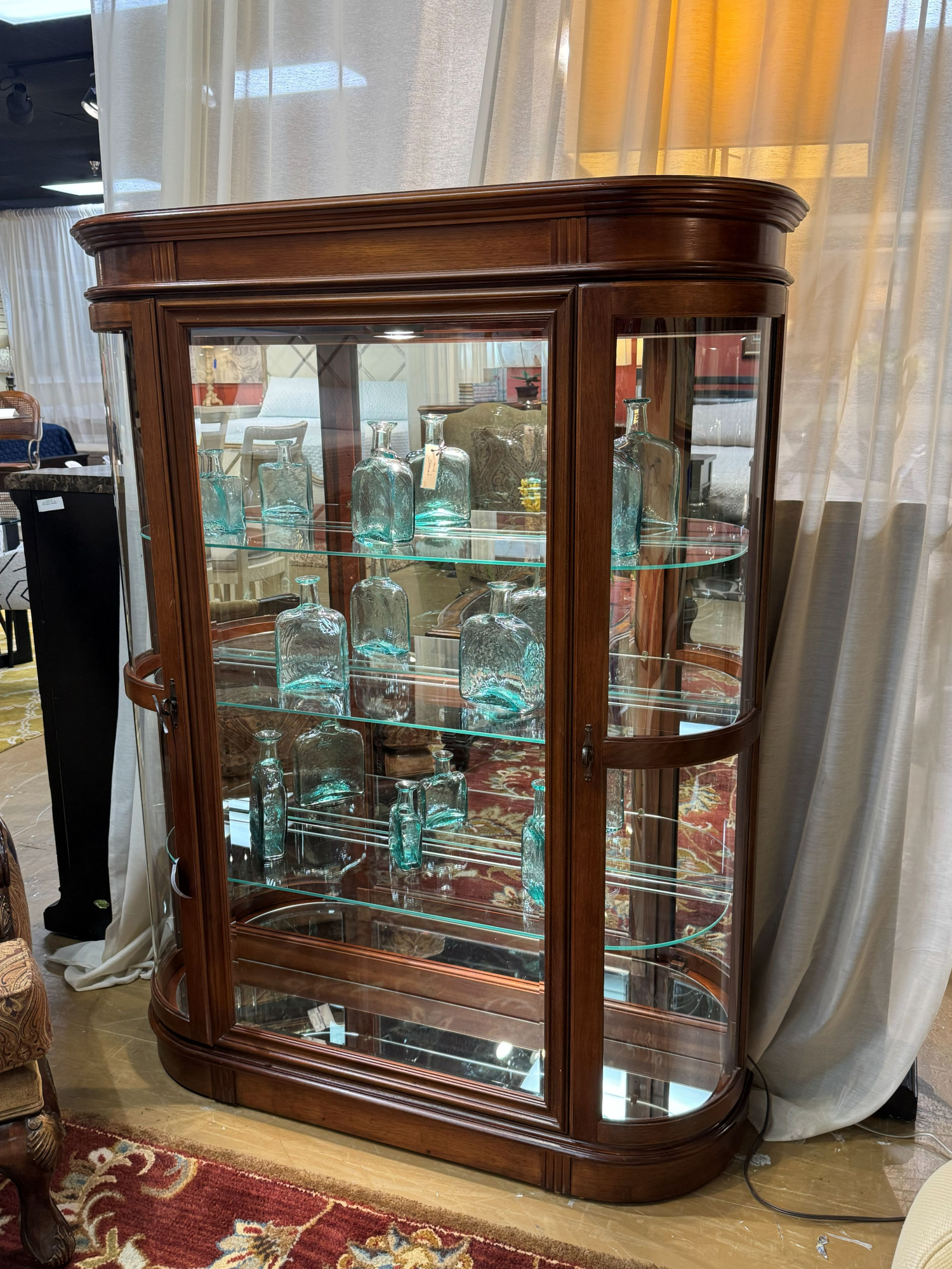 Pulaski curio cabinet in a dark finish. There are three glass shelves inside with mirrored interior. It is lit as well. 48”long x 13”deep x 63”high.