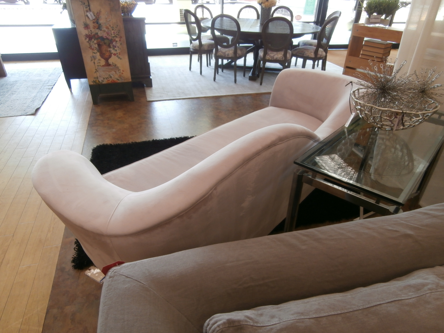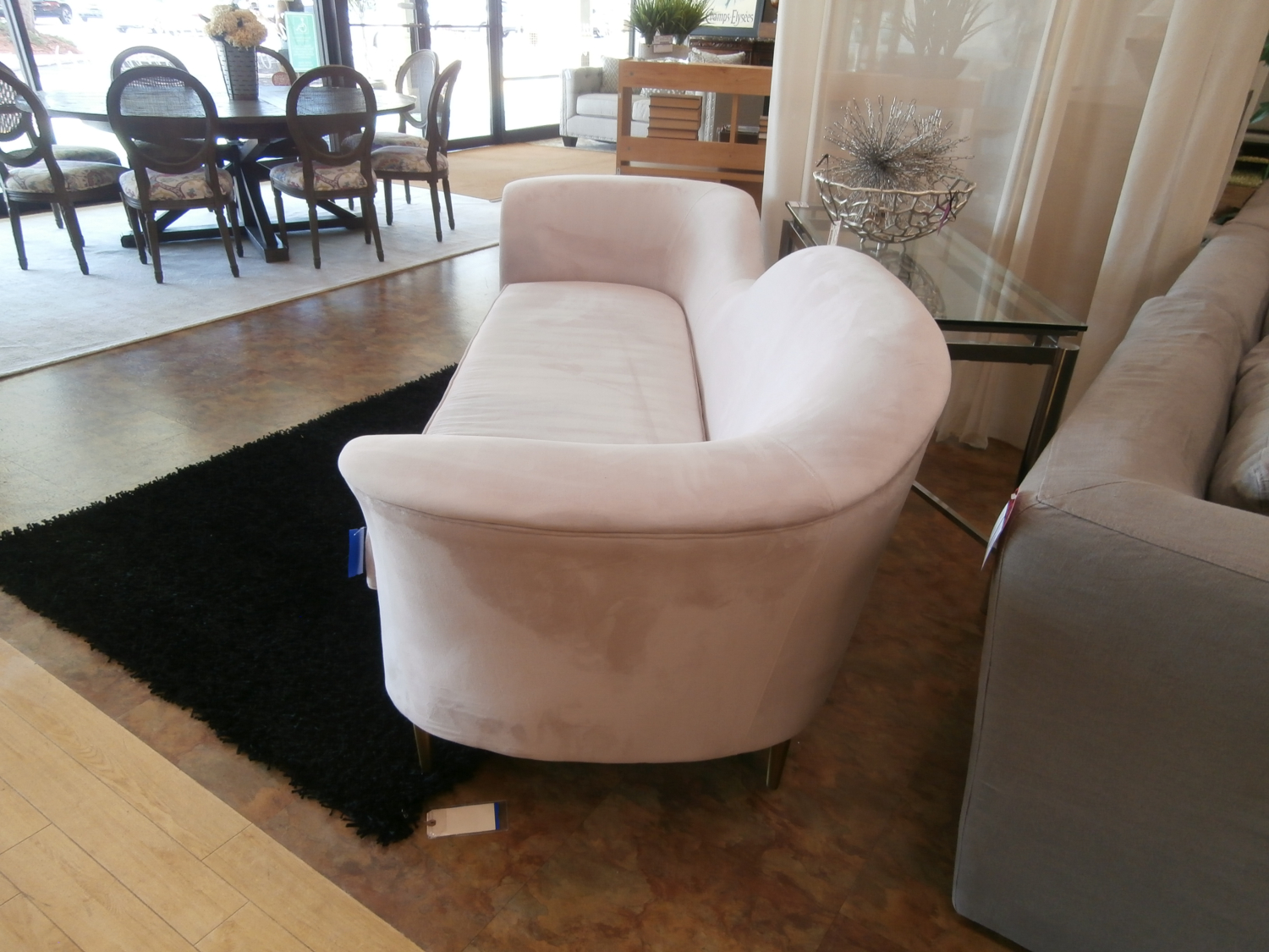 Hollywood glam is beautifully defined with this TOV velvet sofa. Its sloping silhouette, gold legs and luxurious upholstery, make this sofa a true statement piece. Measures 99"W,34"D,36"H in pale pink.