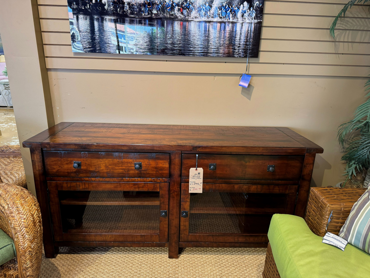 Pottery Barn Benchwright rustic plank top media console in a dark walnut finish. There are two drawers with a shelf behind each glass door below. 65”long x 20”deep x 30”high.