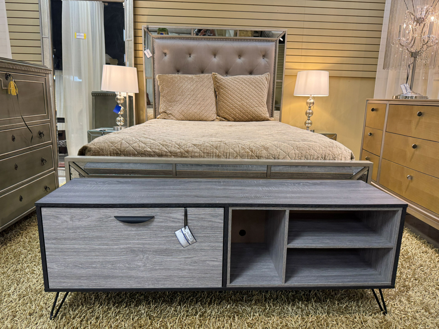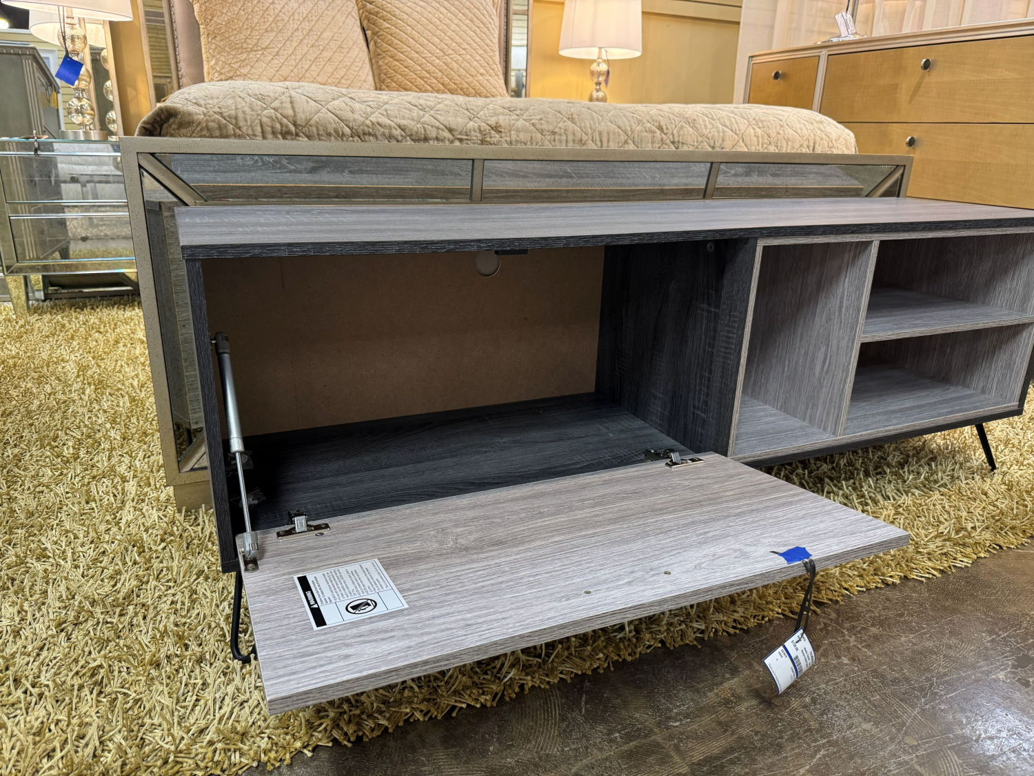 Rustic modern media console in light and dark gray on metal hairpin legs. Dropfront on the left provides ample storage space with open cubby space on the right. 59”long x 16”deep x 21”high.