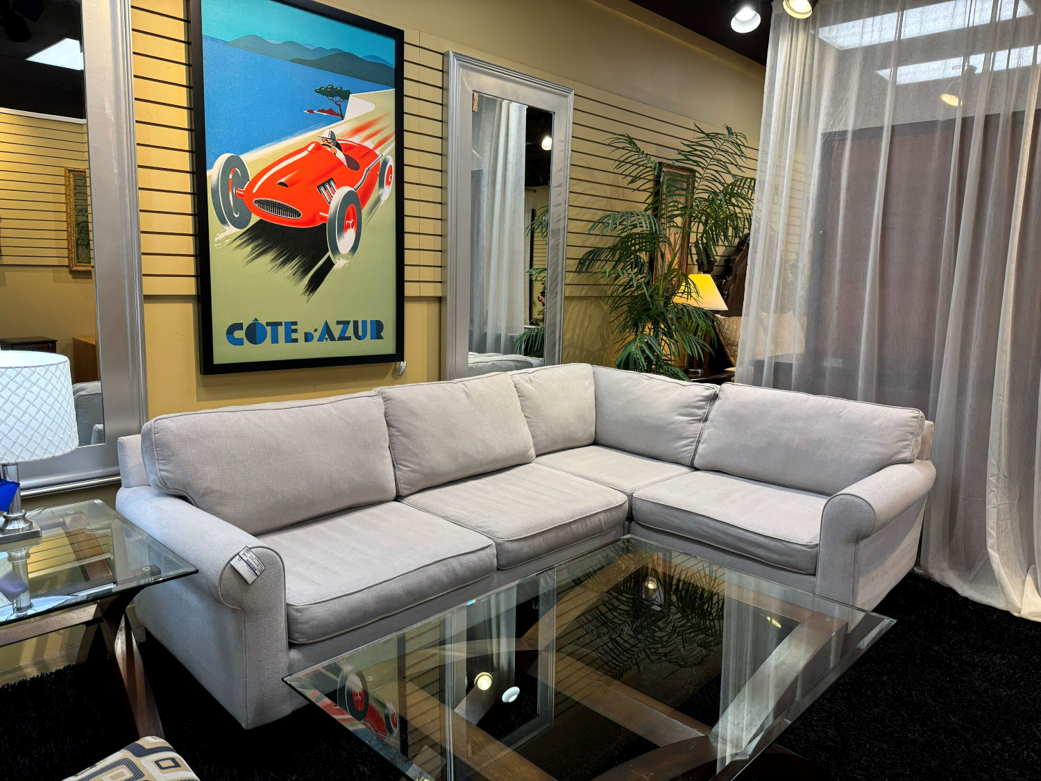 Havertys three piece contemporary style sectional in a gray upholstery on dark wood feet. Nice, rolled arms. Offers a great amount of seating space without being oversized. 108”long x 76”wide x 31”high.