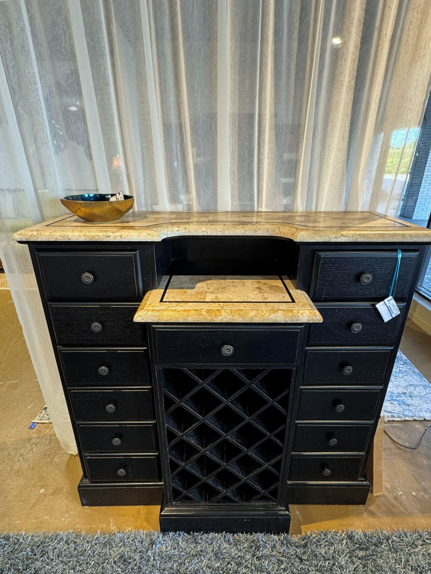 Stone top chest with center wine rack in black. There are 13 drawers. Great amount of storage space. 52"wide x 24"deep x 51"high.