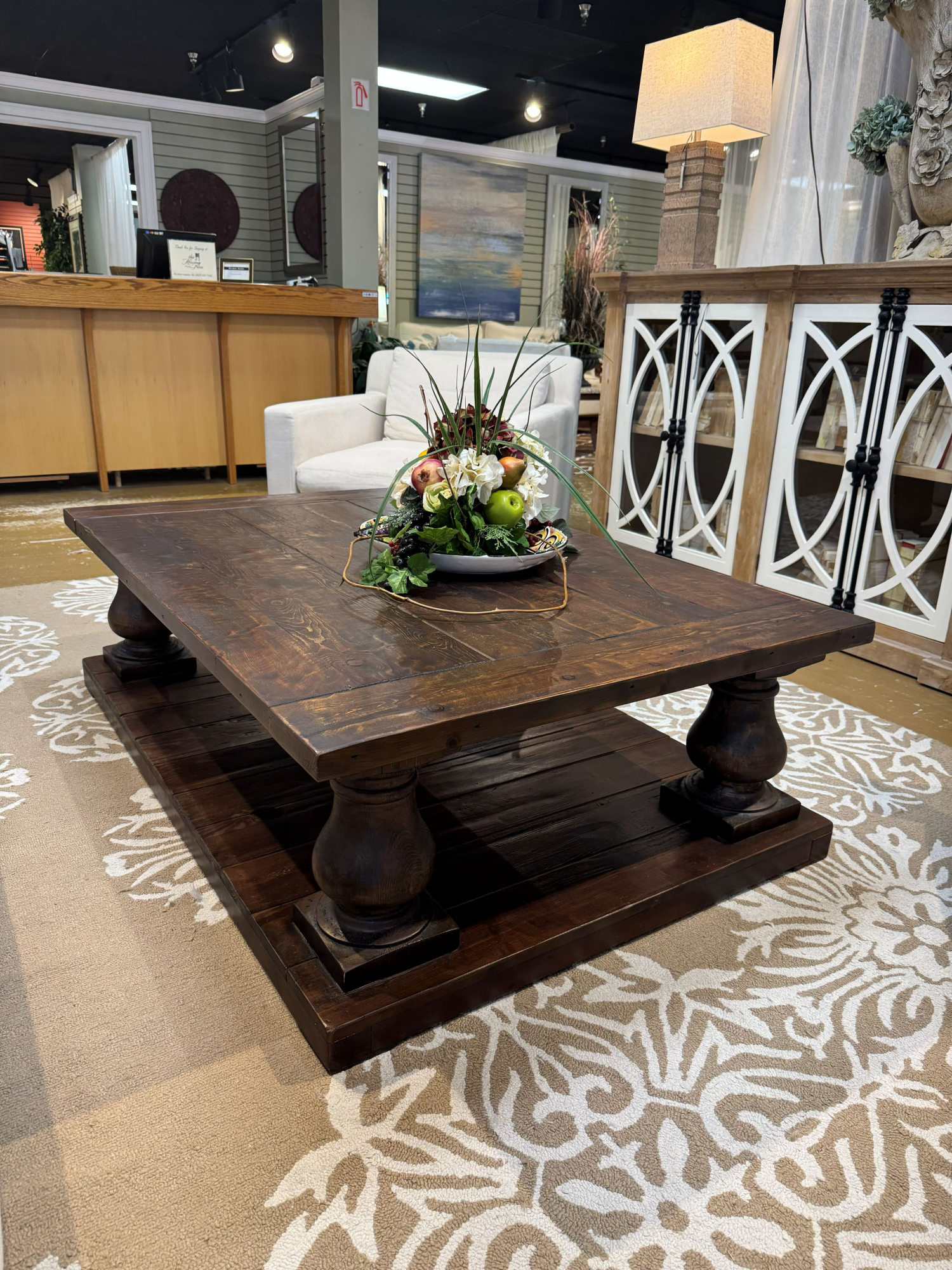 Rustic plank top balustrade coffee table in a rich dark finish. Made for a spacious room. Measures 60"long x 40"wide x 18"high.
