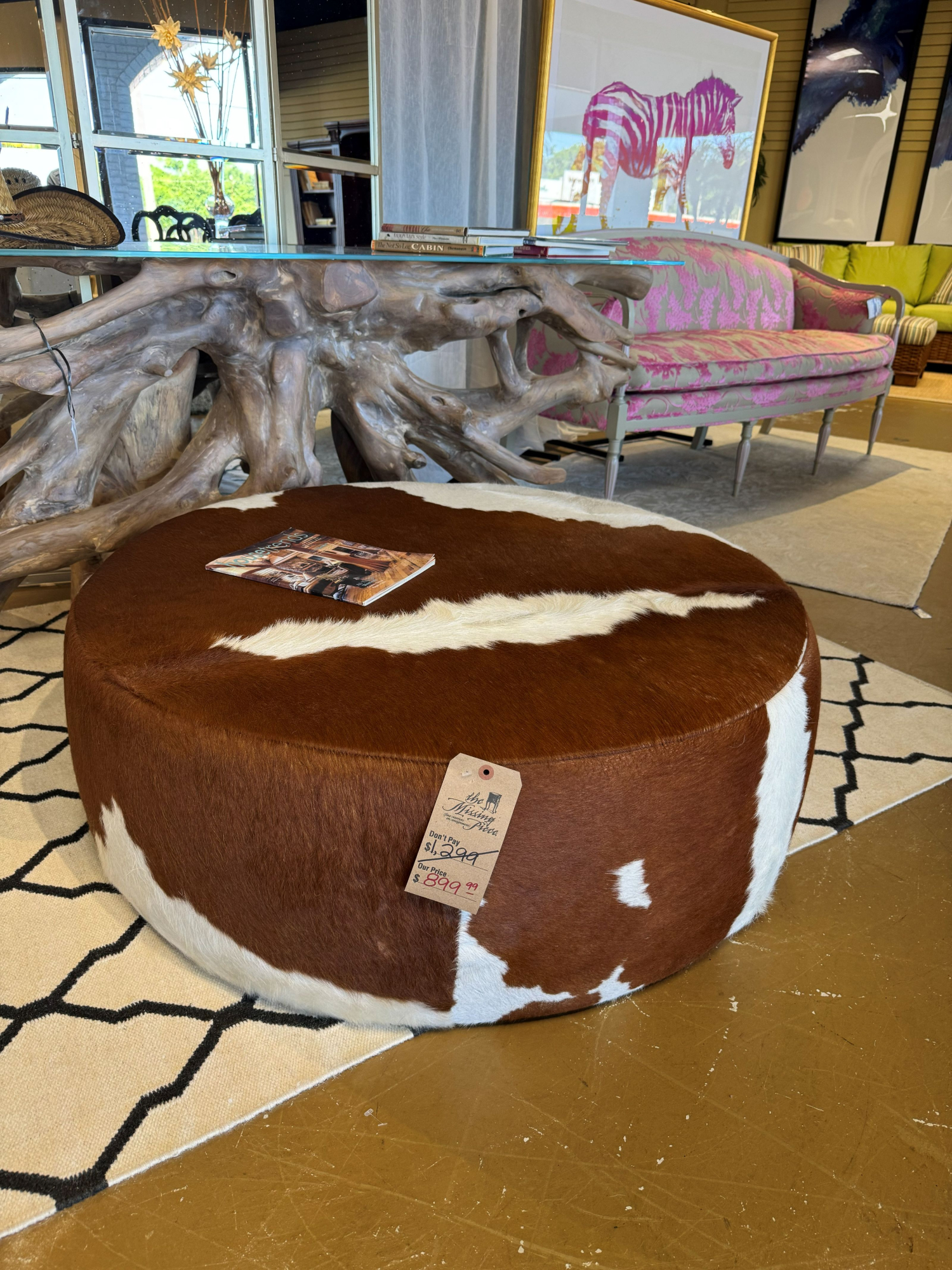 Room & Board Lind ottoman in a brown and white cowhide. Each cowhide displays unique variations in pattern & color. No two are exactly alike, ensuring that your ottoman is one of a kind. 42"round x 16"high.