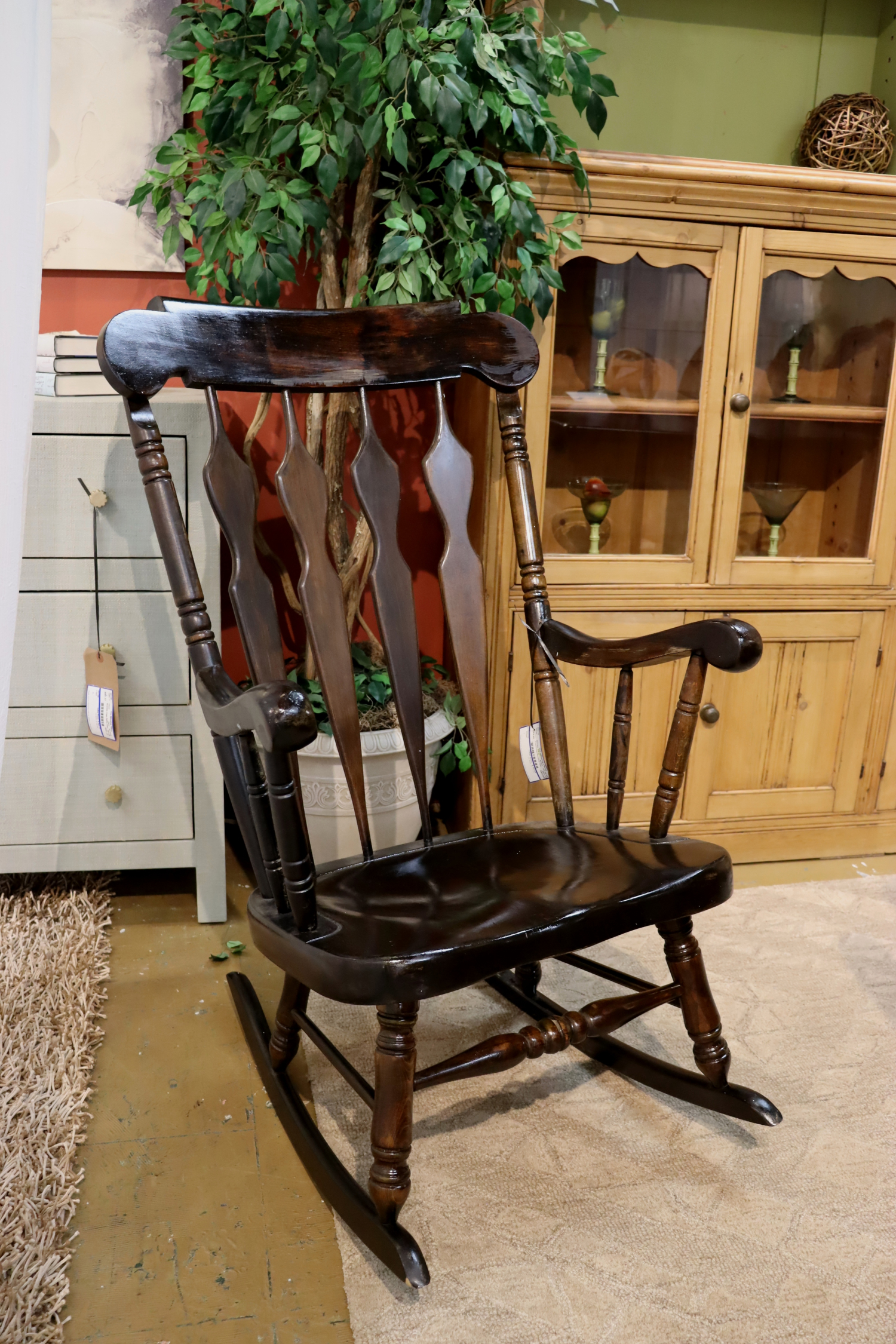 Traditional style rocking chair in a distressed black finish. 26”wide x 30”deep x 42”high.