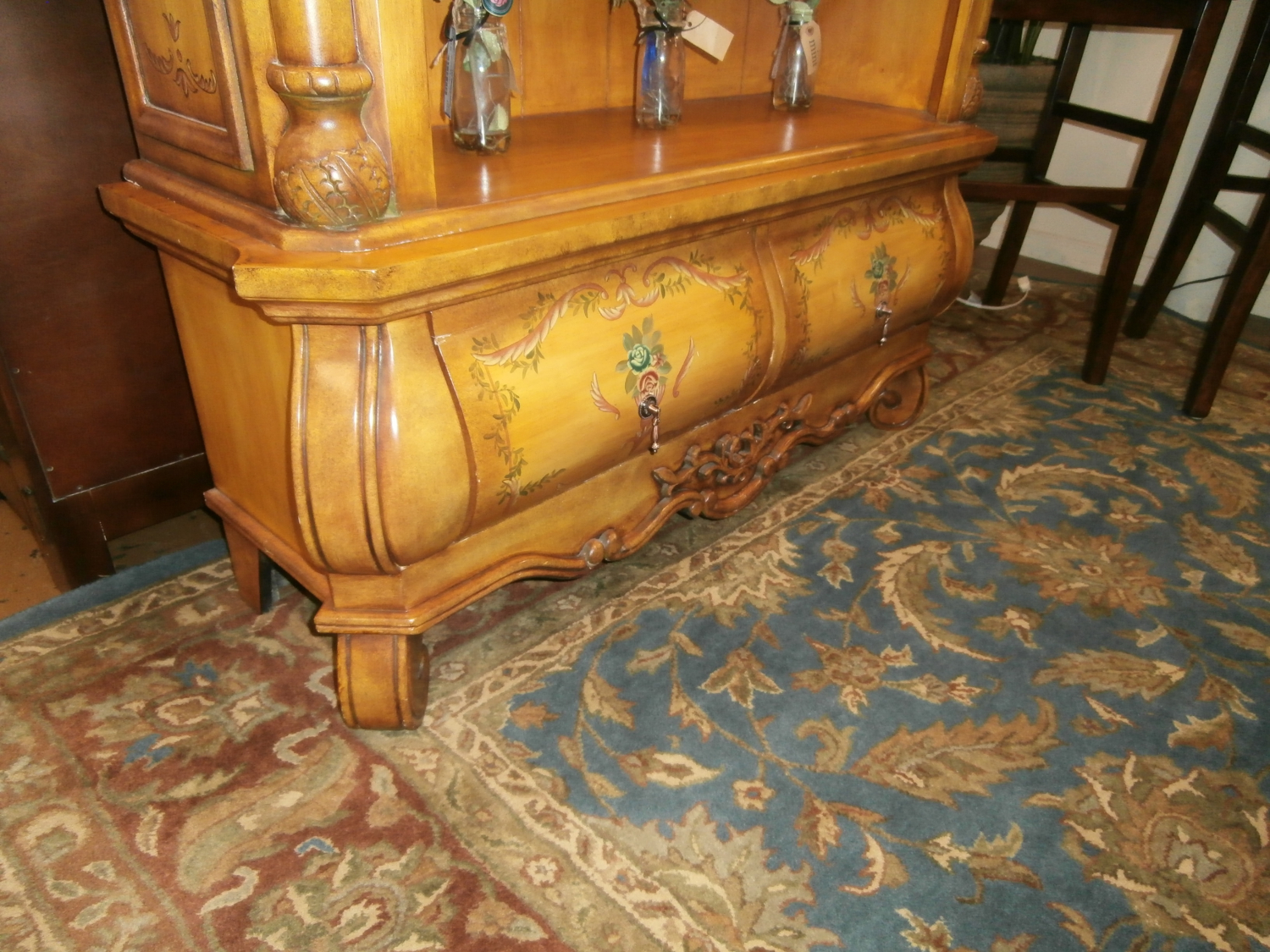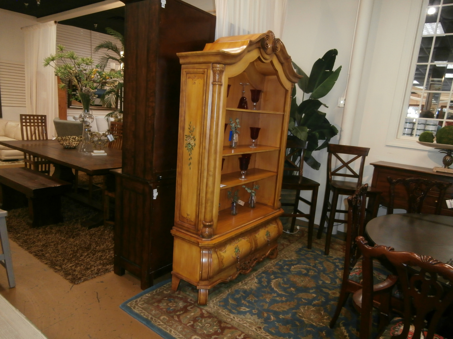 French country style bookcase in a warm honey finish with painted accents. There are three shelves with two drawers below.Measures 47"W,16"H,80"H in natural.